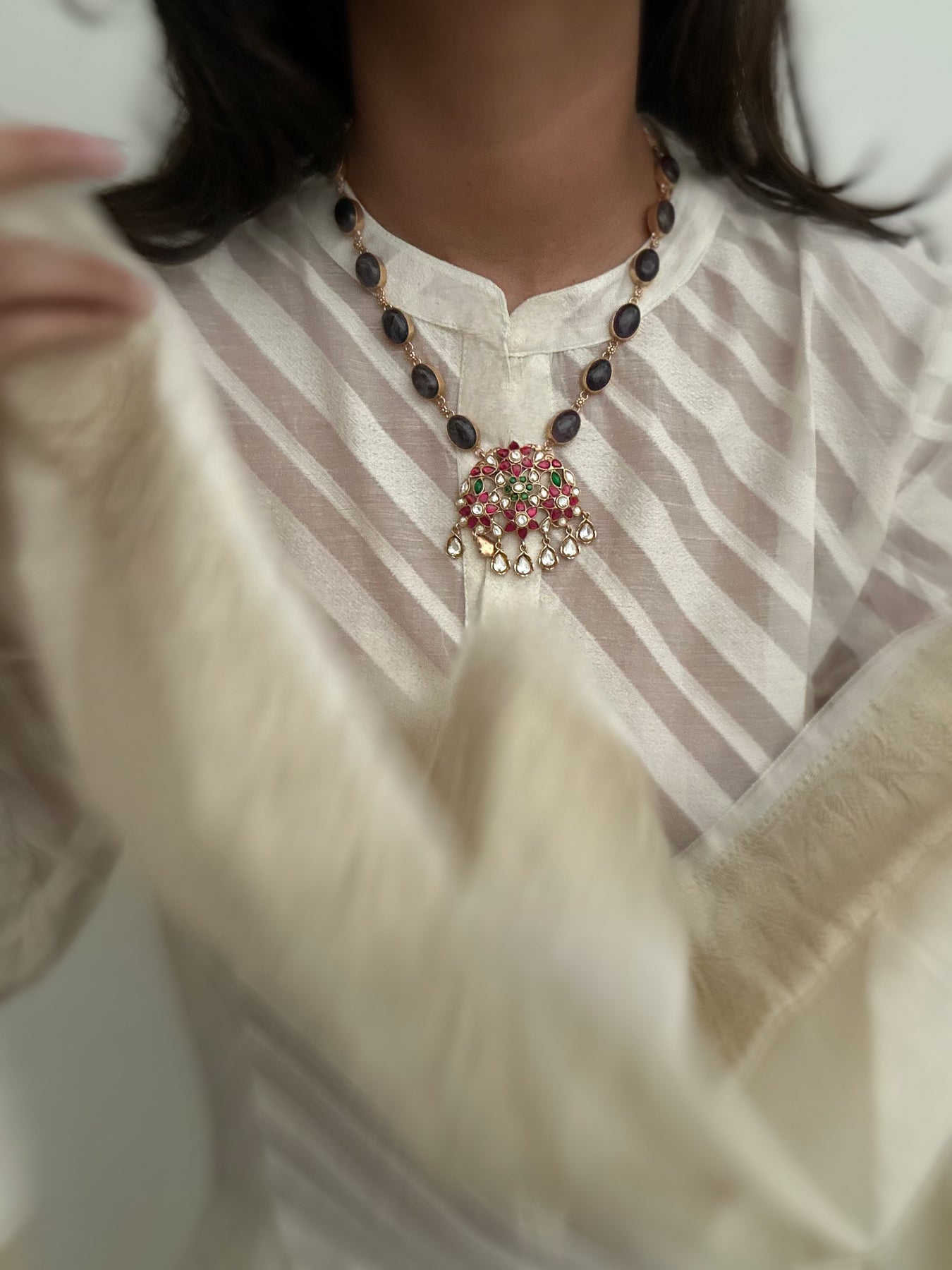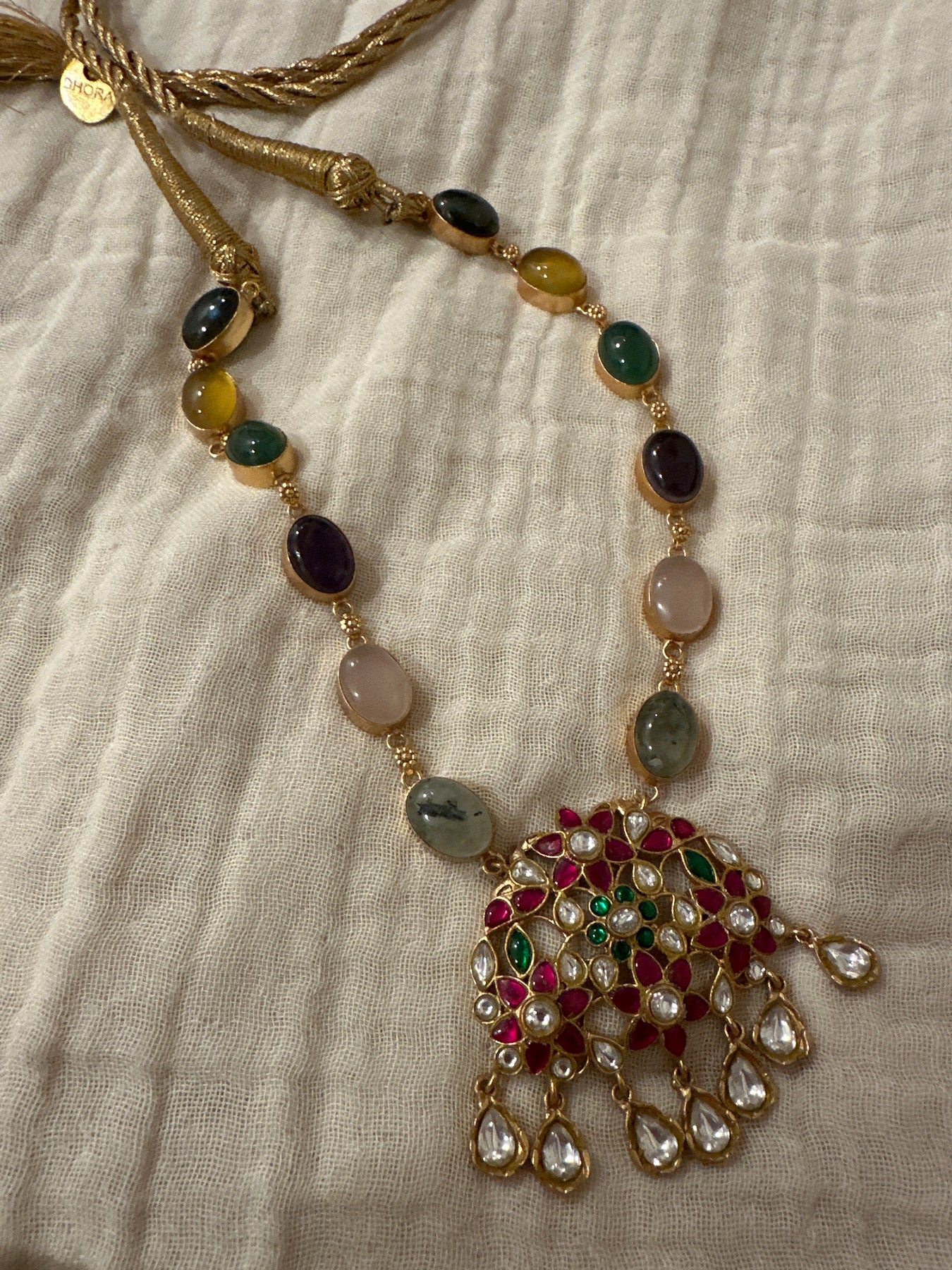 A timeless statement in regal craftsmanship, this necklace is handmade in alloy silver, dipped in gold, and adorned with traditional jadau work. The vibrant pendant features a floral motif in rich red and green stones, finished with delicate drop accents, strung on a chain of deep-toned oval stones.