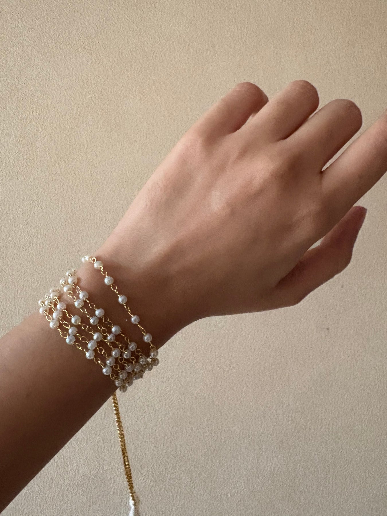 This six lines bracelet is made with cultured pearls and comes with a metal drawstring.