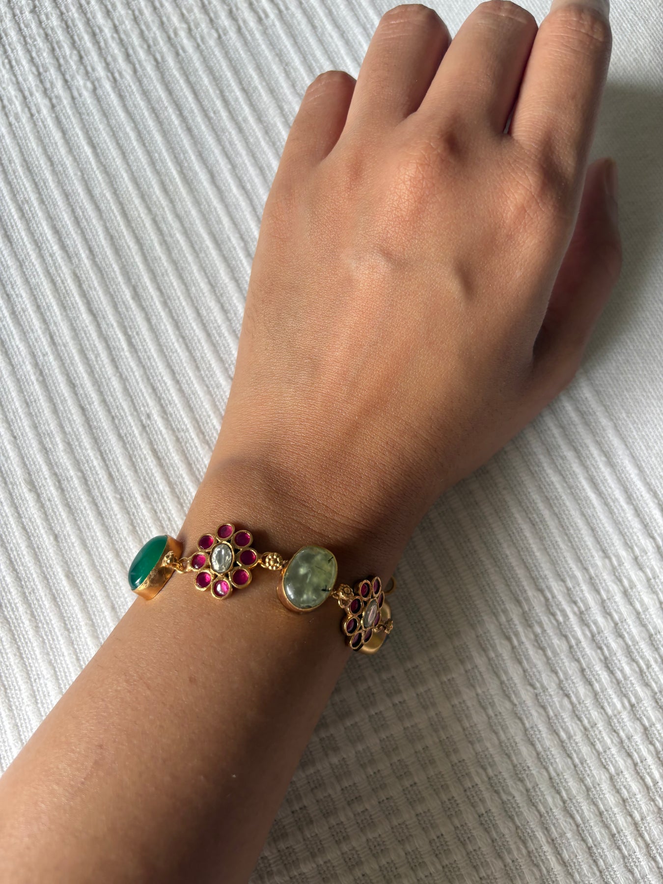 This bracelet is handcrafted in an alloy of silver dipped in gold. This is made with natural stones and jadau charms.