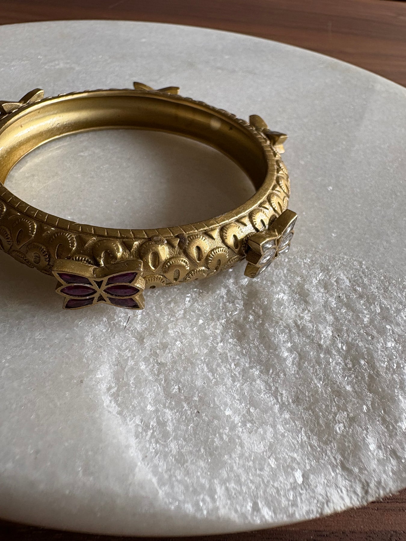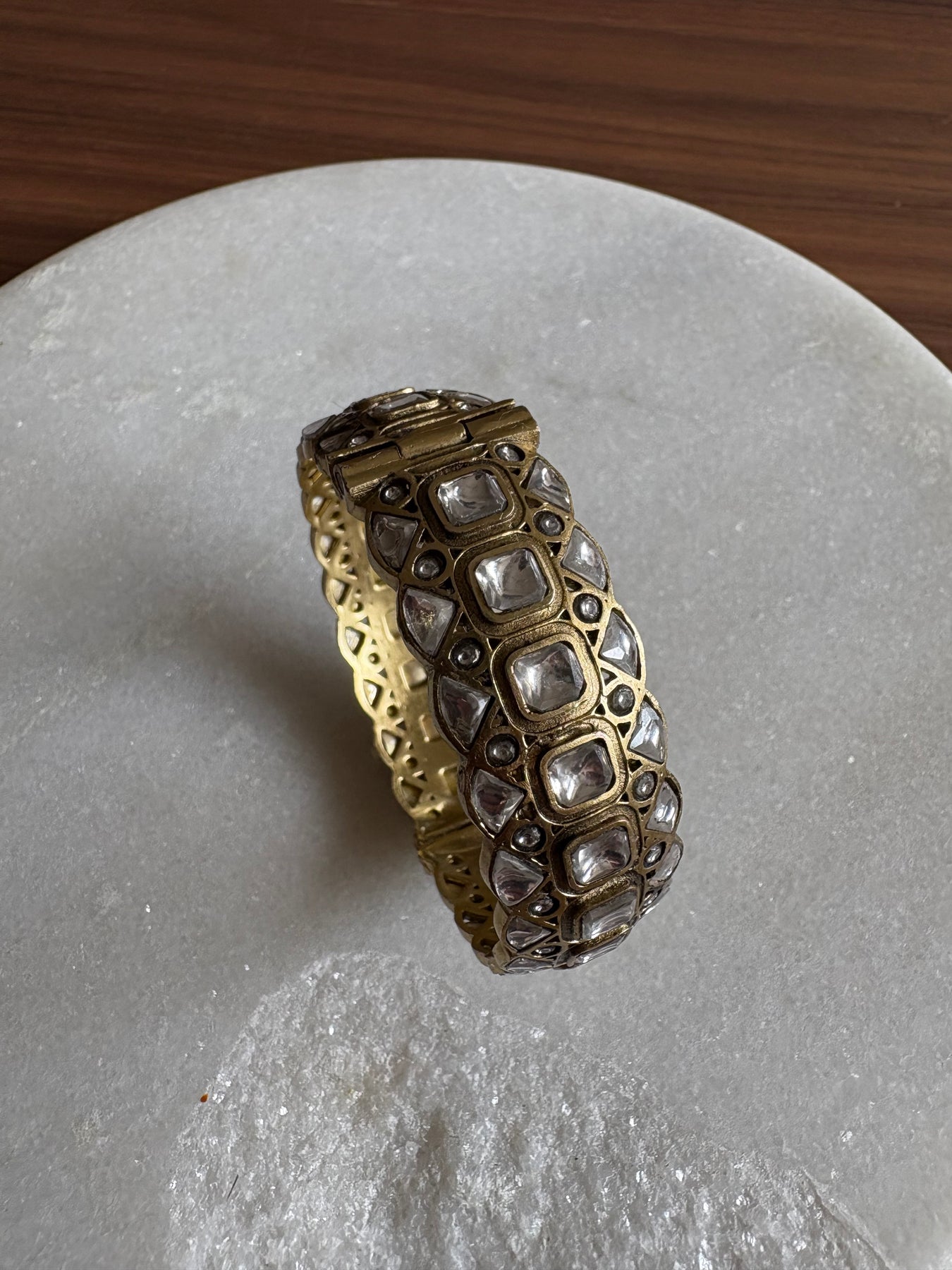 Handcrafted Kundan bracelet, meticulously designed in silver and base metal with an elegant gold polish. Adorned with white topaz, this timeless piece reflects the artistry and heritage of traditional craftsmanship.