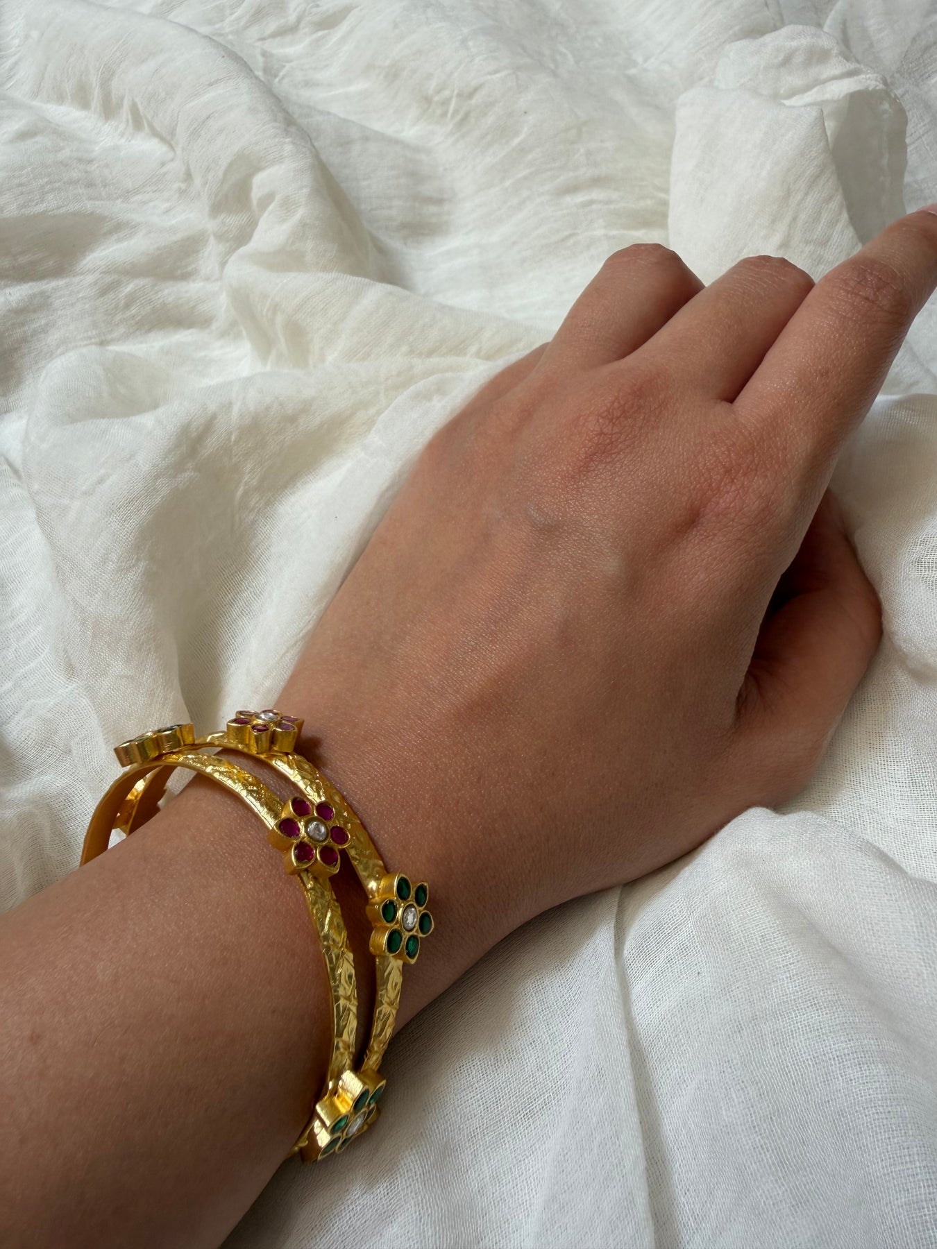 Made in brass with silver and semi precious jadau flowers. Size 2.4. Comes as a pair.