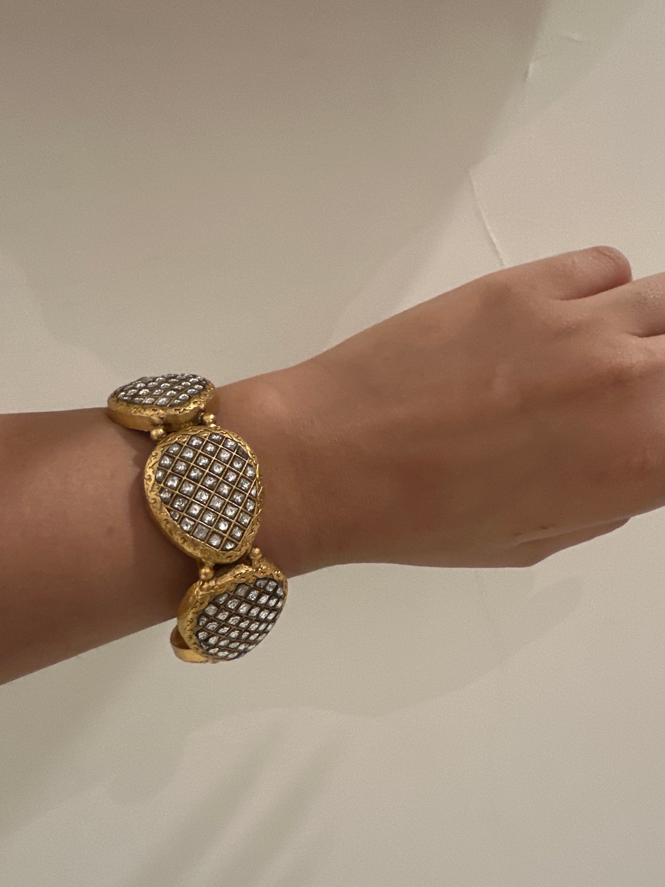 A bold tribute to regal latticework, the Mughal Mesh Cuff features oval medallions encrusted with white topaz in a grid setting. Inspired by antique Mughal armour motifs, it’s dipped in gold and finished with intricate engraving along the edges — an heirloom reimagined. Priced individually and size 2.4