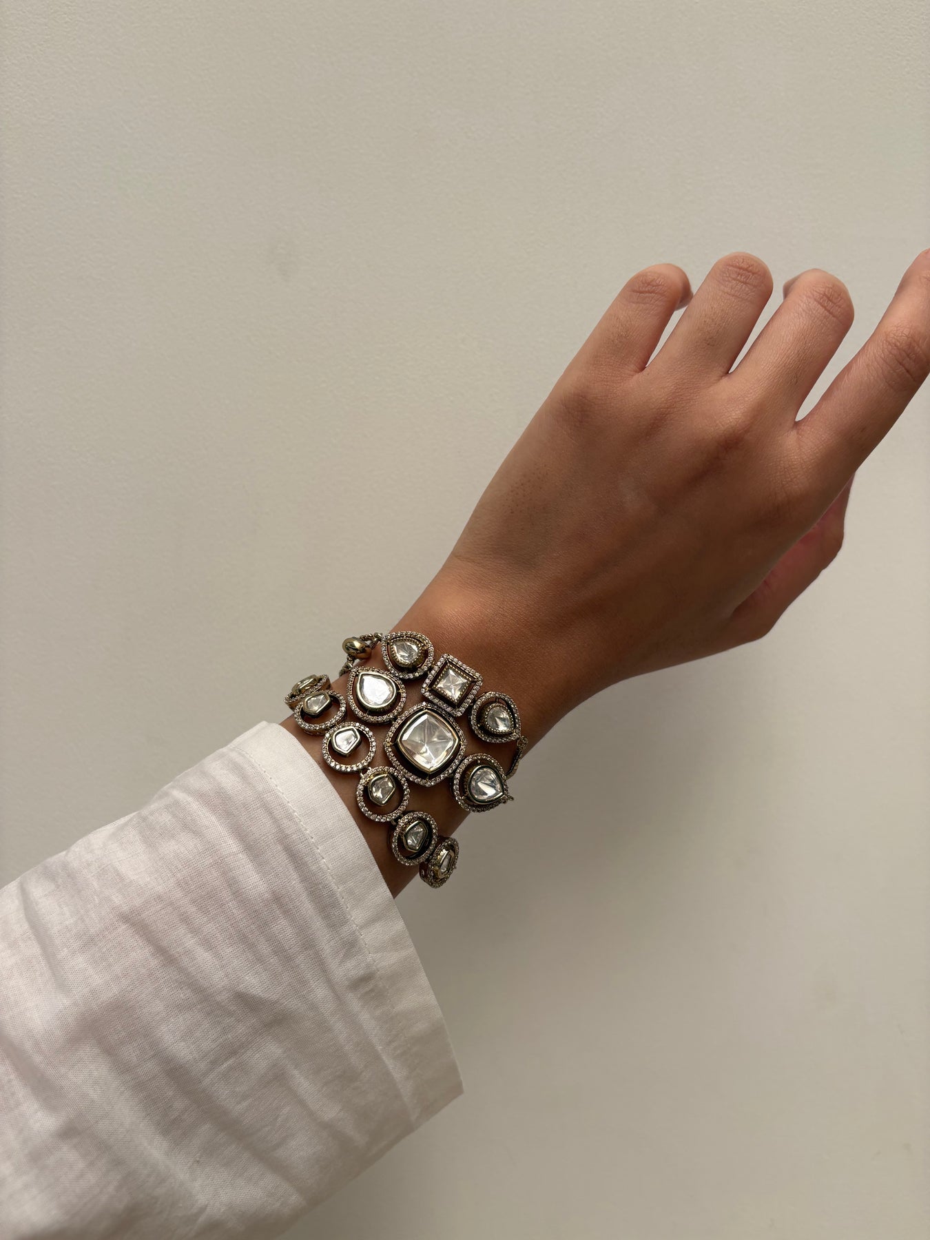 Exuding vintage elegance, these statement cuffs are crafted in base metal and set with shimmering clear quartz in assorted cuts. The intricate Victorian-inspired detailing lends them a regal charm, while the adjustable drawstring closure ensures a perfect fit. Perfect for layering or wearing solo, they bring a touch of old-world glamour to any outfit.