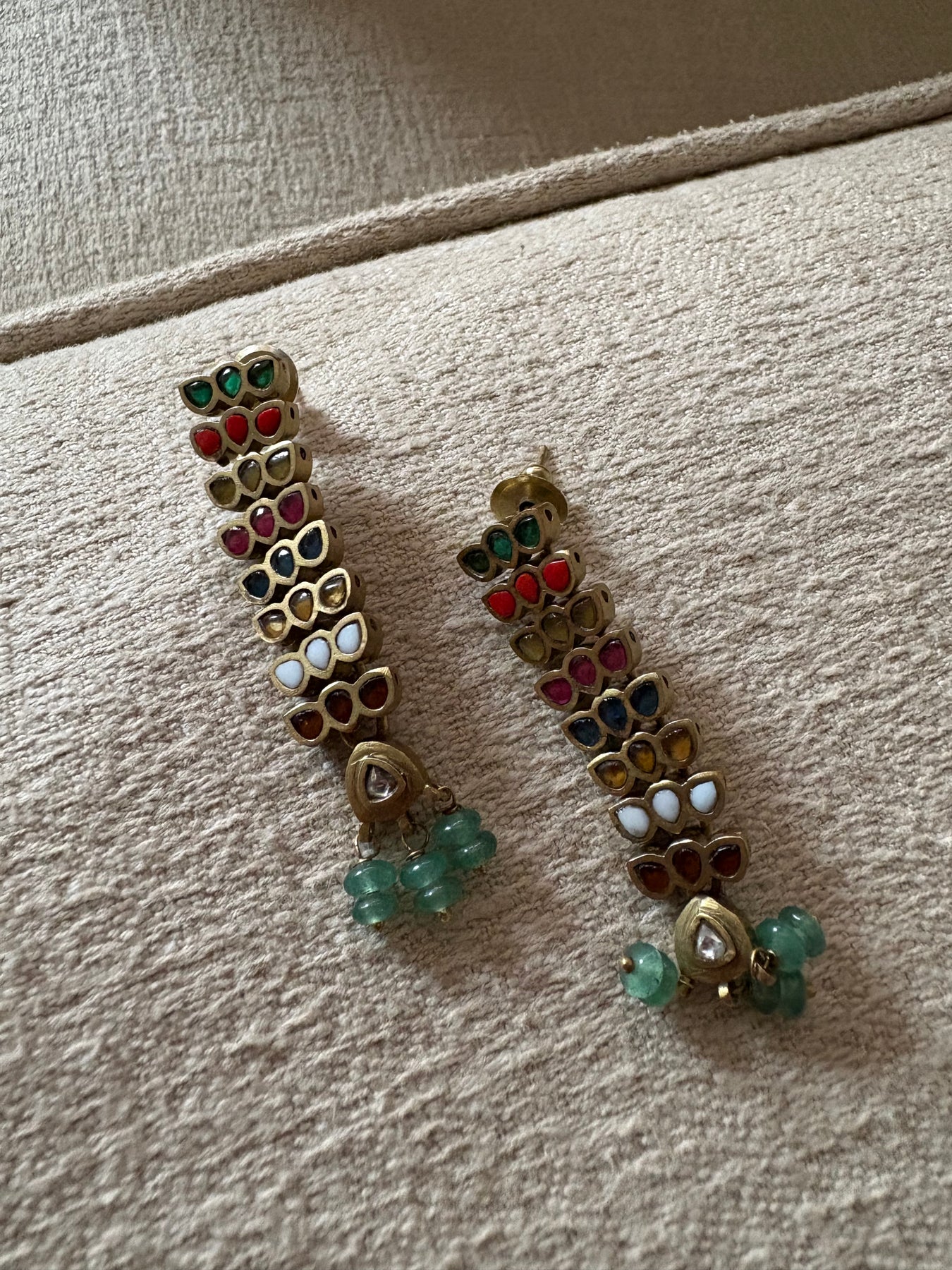Indulge in the ultimate luxury with these stunning earrings. Handcrafted with an alloy silver and delicately plated in gold, each earring is adorned with semi precious stones that add a touch of glamour to any outfit. Elevate your style with these exquisite earrings.