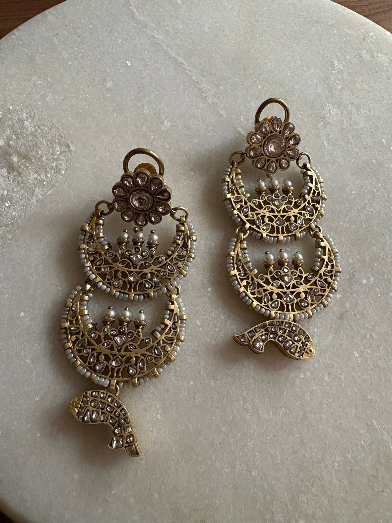Indulge in the ultimate luxury with these stunning earrings. Handcrafted with an alloy silver and delicately plated in gold, each earring is adorned with Kundan that adds a touch of glamour to any outfit. Elevate your style with these exquisite earrings.