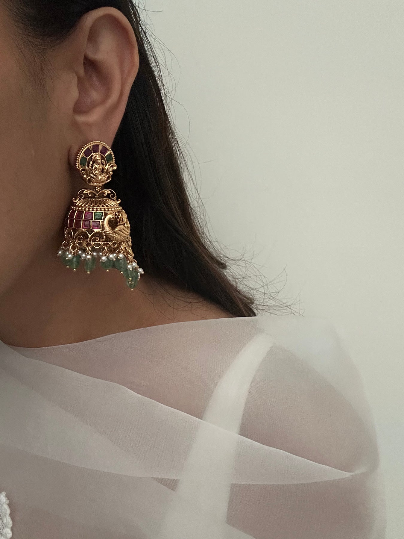 Inspired by the grandeur of South Indian temple jewellery, these jhumkas are crafted in base metal, dipped in gold, and adorned with semi-precious stones. A timeless blend of heritage and elegance, perfect for elevating any festive or wedding look.