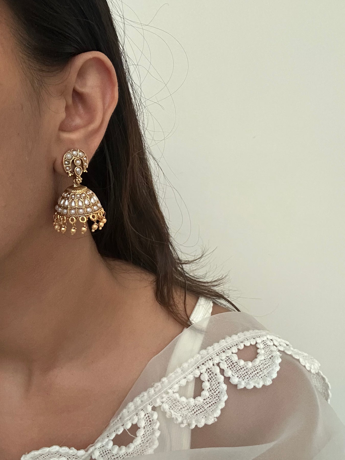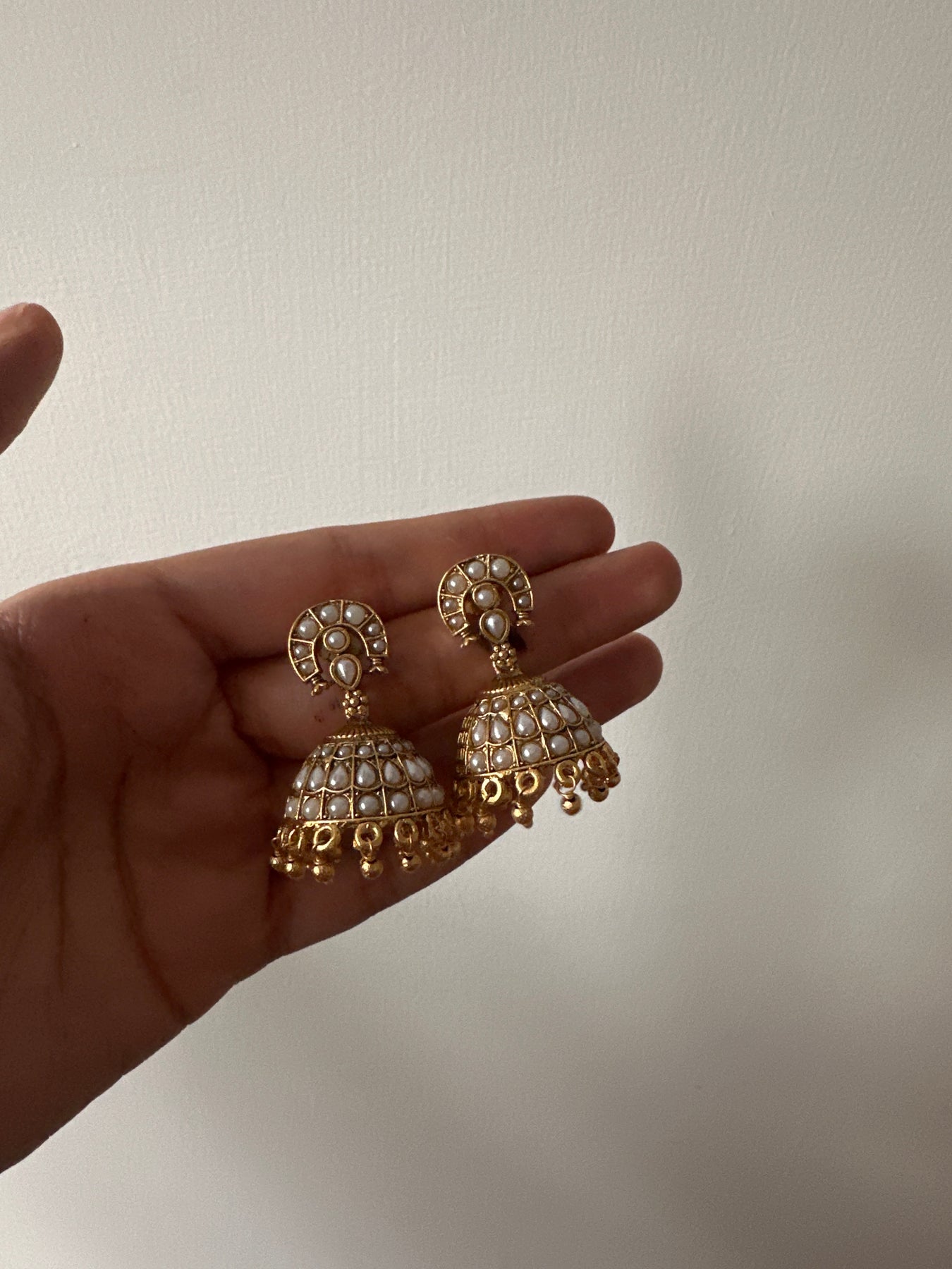 Inspired by the grandeur of South Indian temple jewellery, these jhumkas are crafted in base metal, dipped in gold, and adorned with semi-precious stones. A timeless blend of heritage and elegance, perfect for elevating any festive or wedding look.