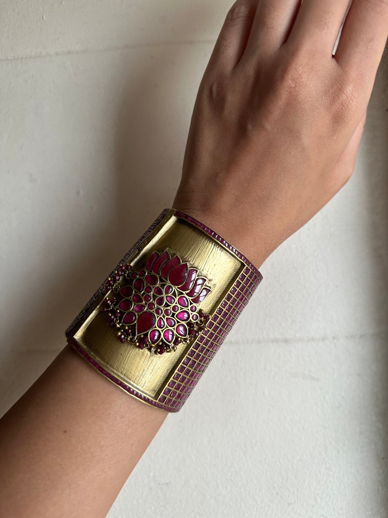 Gold plated cuff made in silver and base metal and semi precious stone. Approx for size 2.4 to 2.6 , opens with long screw.