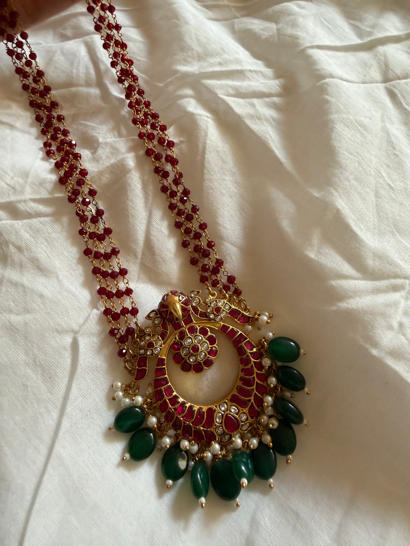 Handcrafted in base metal with semi precious stones , comes with a 26 inch red onyx chain with drawstring behind.