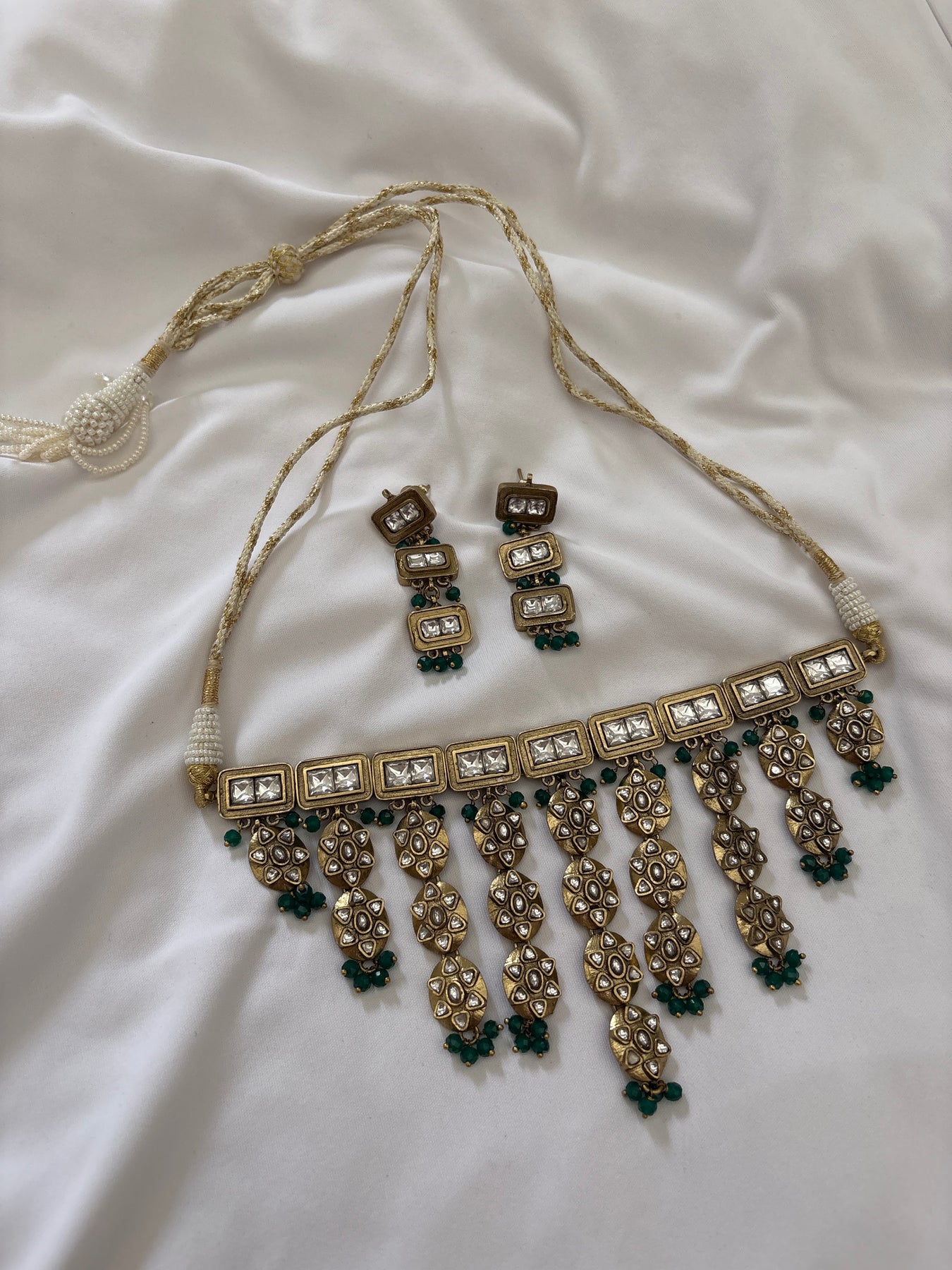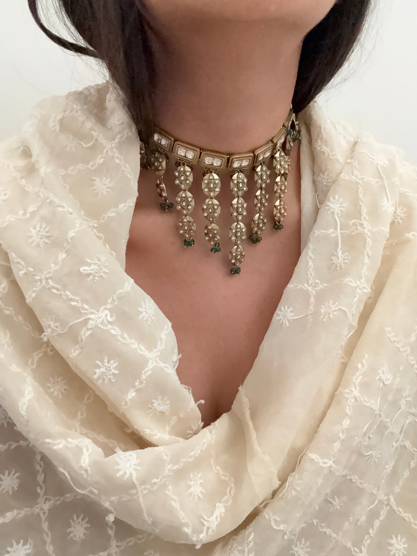 Gold plated necklace , handcrafted in silver and base metal with semi precious stones. Comes with earrings.