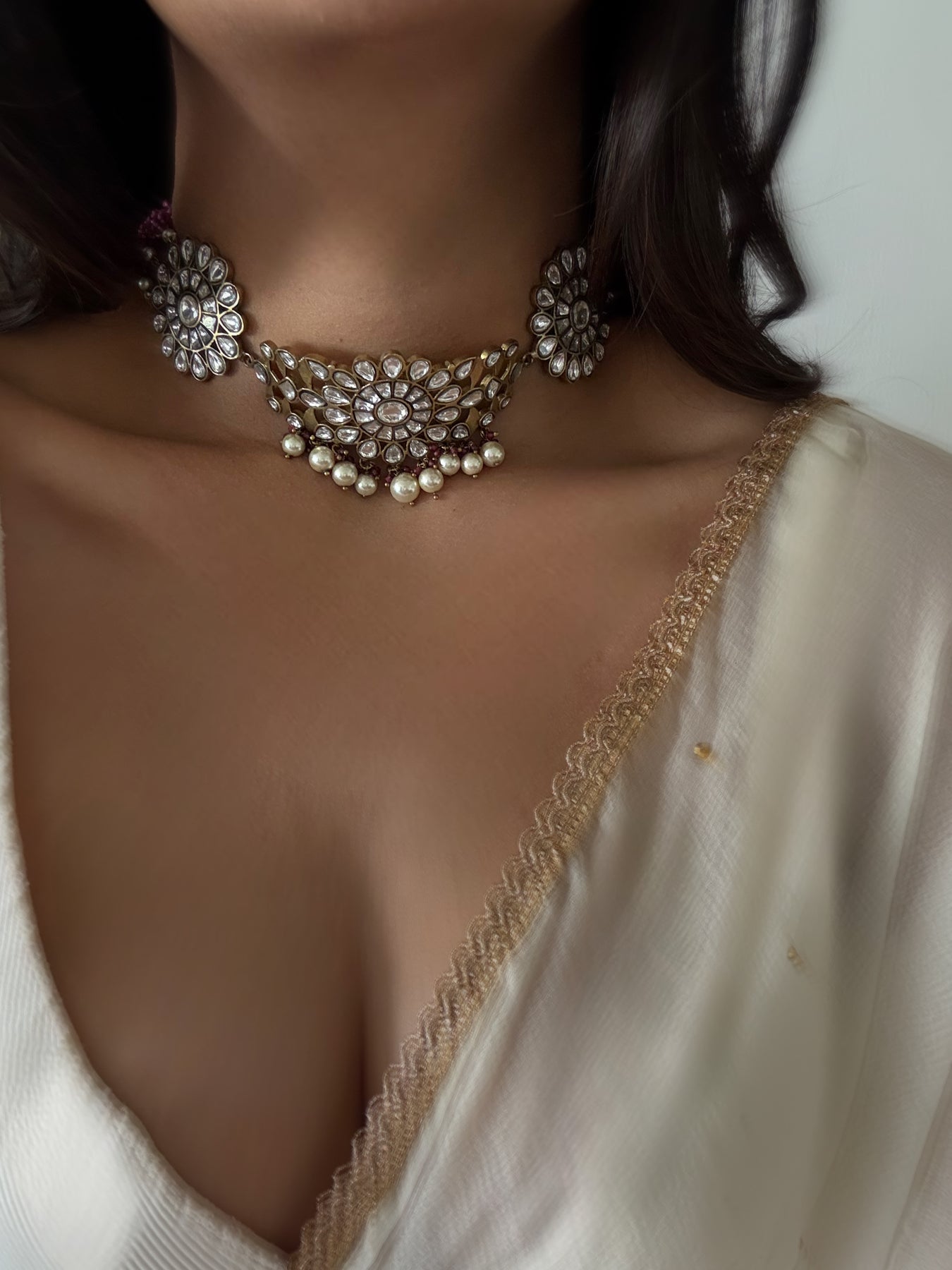 Delicately set with intricate jadau work and handpicked semi-precious stones, it reflects the elegance of traditional craftsmanship while remaining versatile for contemporary wear.
