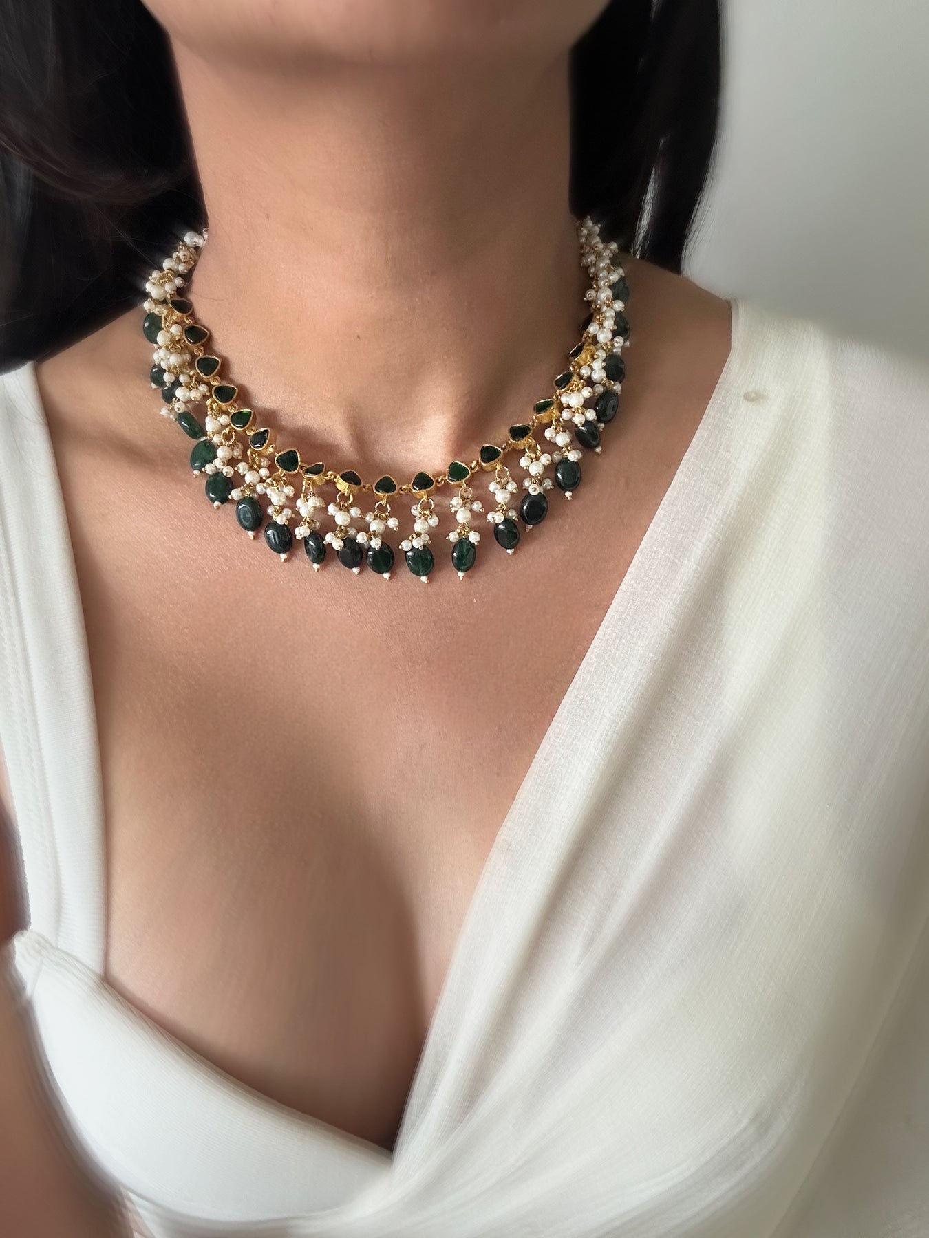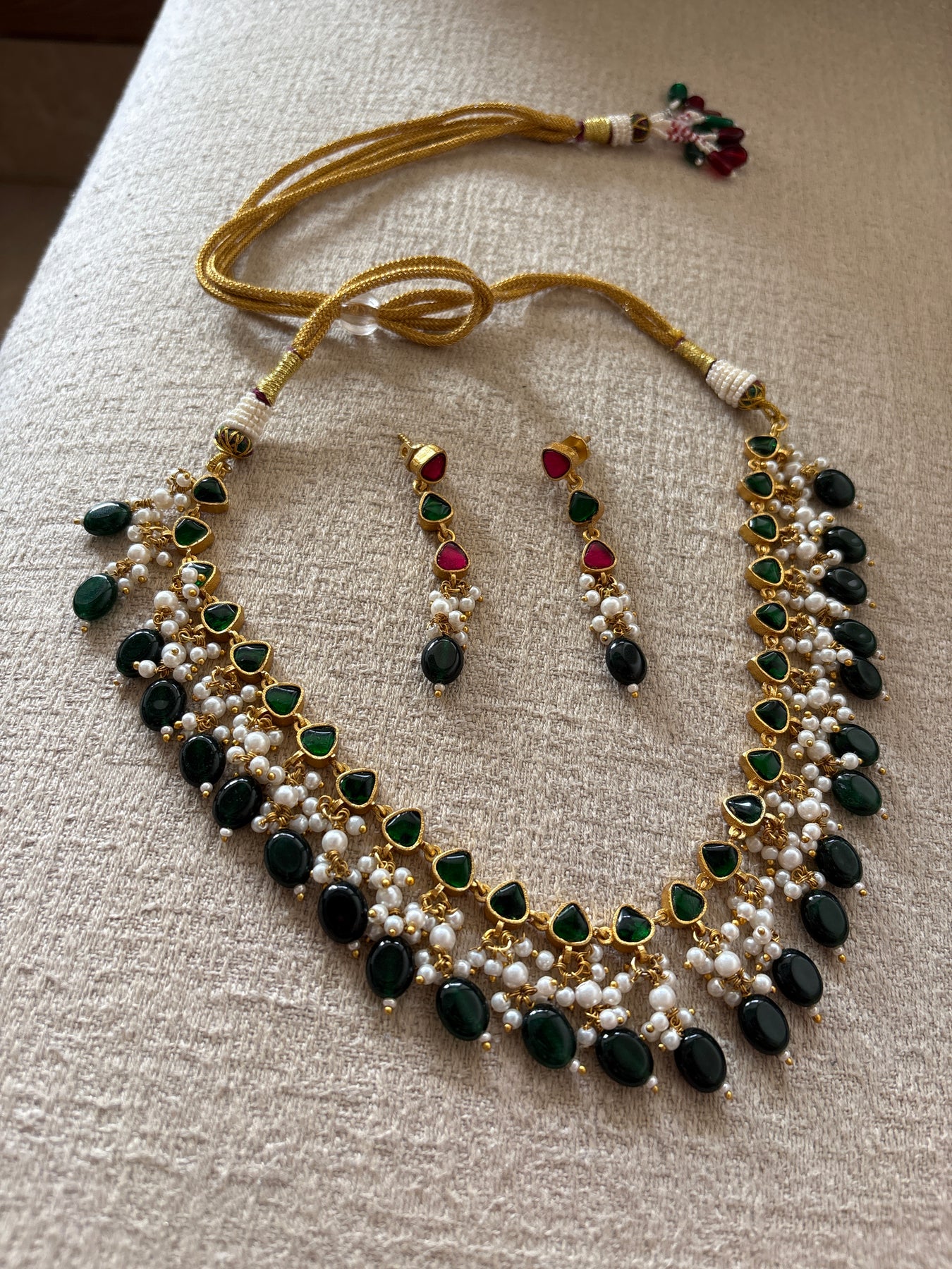 The set includes a matching pair of earrings designed to complement the necklace perfectly, making it an ideal choice for formal events, festive occasions, or everyday sophistication.