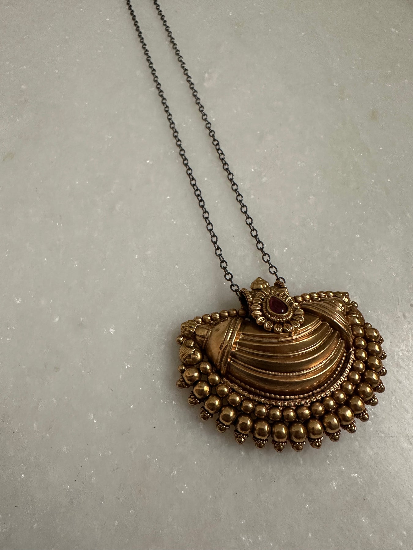 Inspired by the antique tribal jewellery, pendant is meticulously made in high-quality base metal and silver with a dull gold polish on it. It also comes with a 20 inch long black chain.