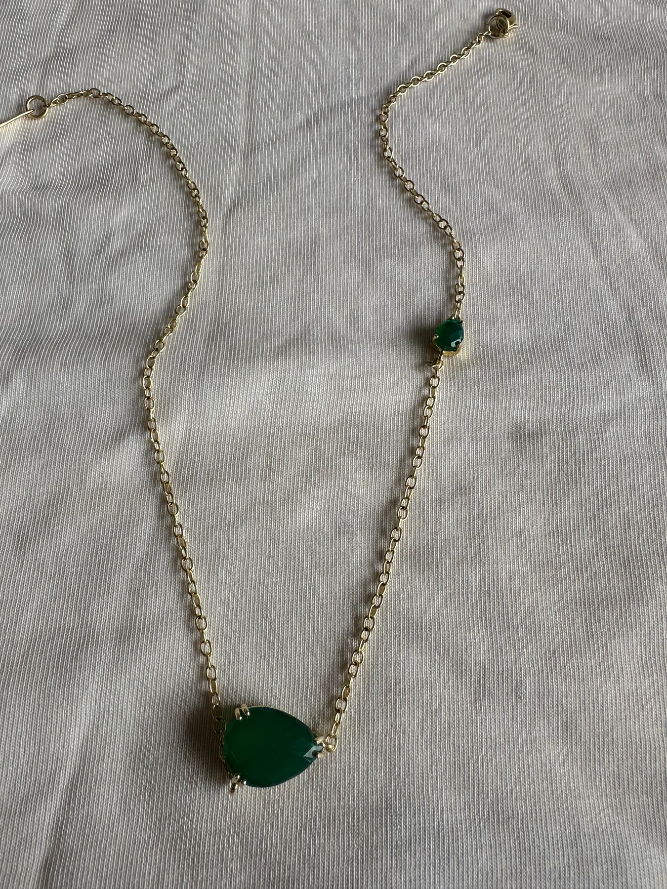 Handcrafted in green chalcedony and base metal. This necklace is 17 inch.