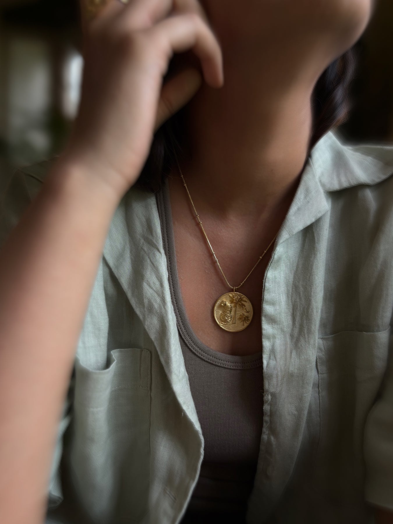 Handcrafted in brass and finished with a rich gold plating, Moonlit Majesty is a wearable tribute to India’s majestic wilderness. A lone tiger rests beneath swaying palm trees and a crescent moon—symbols of power, protection, and quiet resilience.