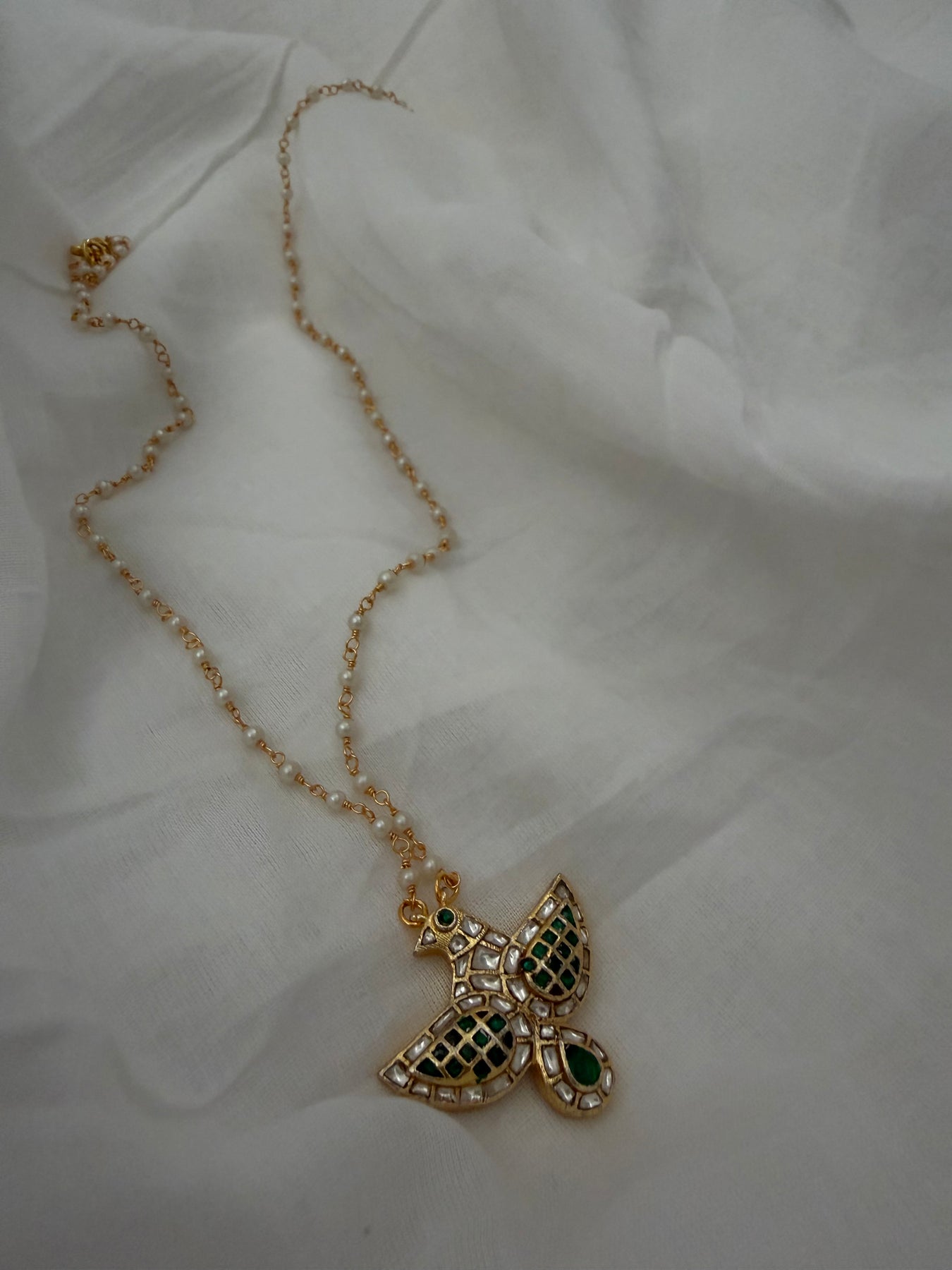 Gold finish Kundan Eagle handcrafted in basement and semi precious stones comes with a 24 inch long cultured Pearl strand.