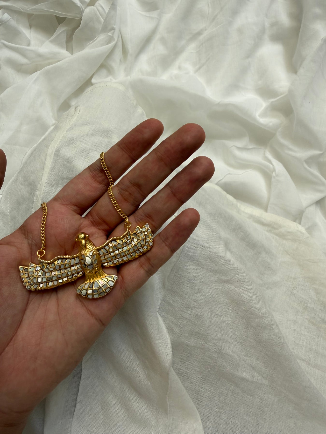 Handcrafted pendant necklaces, suspended on 18 inch chain, made in a silver-based alloy and finished with a rich gold polish. Each piece is created using the ancient Indian art of jadau stone setting, where semi-precious stones are intricately set by hand, celebrating heritage craftsmanship with a contemporary soul.