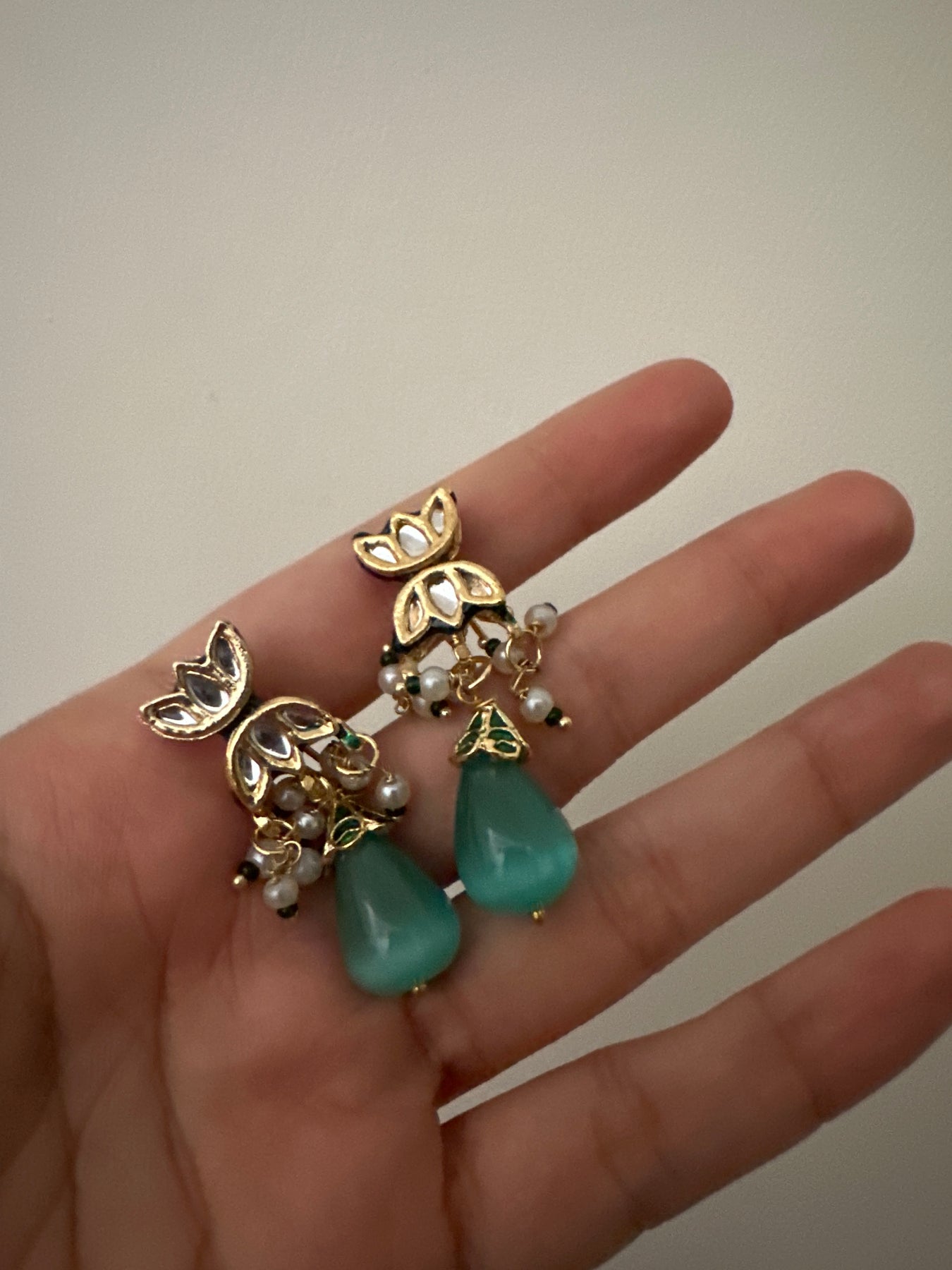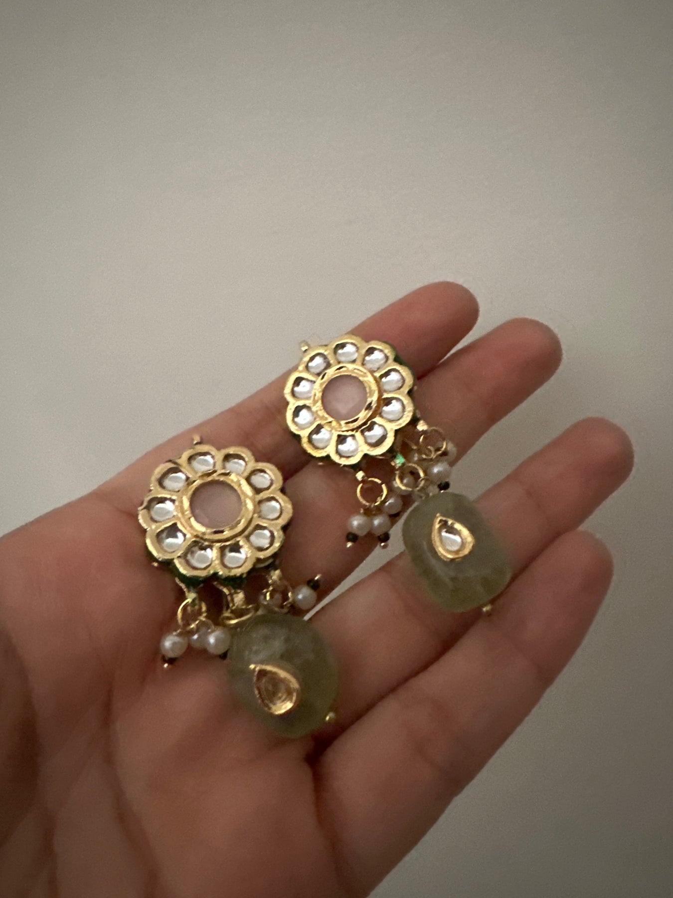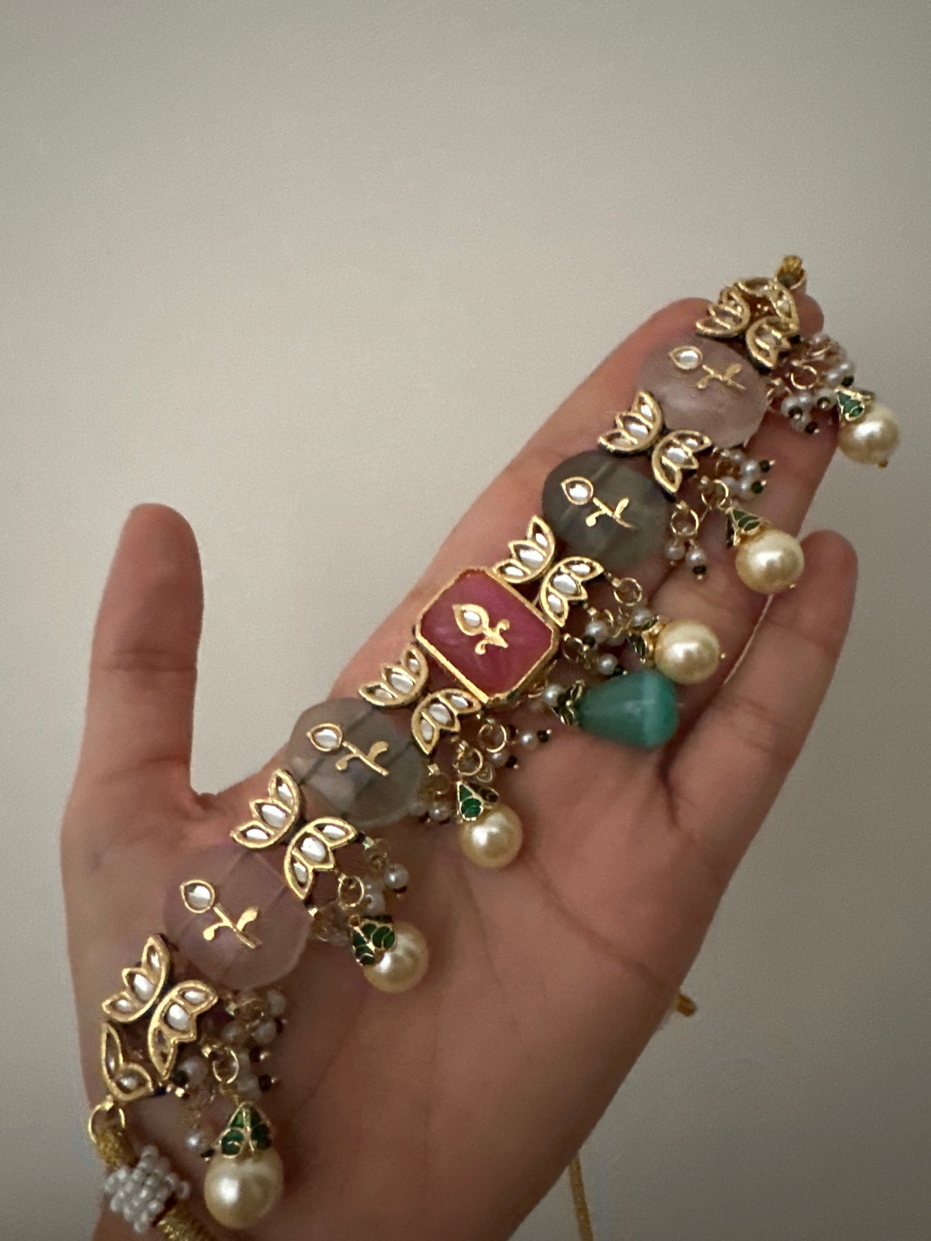 Handcrafted in base metal and cultured pearls , made using aged upcycled charms. This antique looking pastel necklace has hints of washed off meenakari around. Comes with earrings.