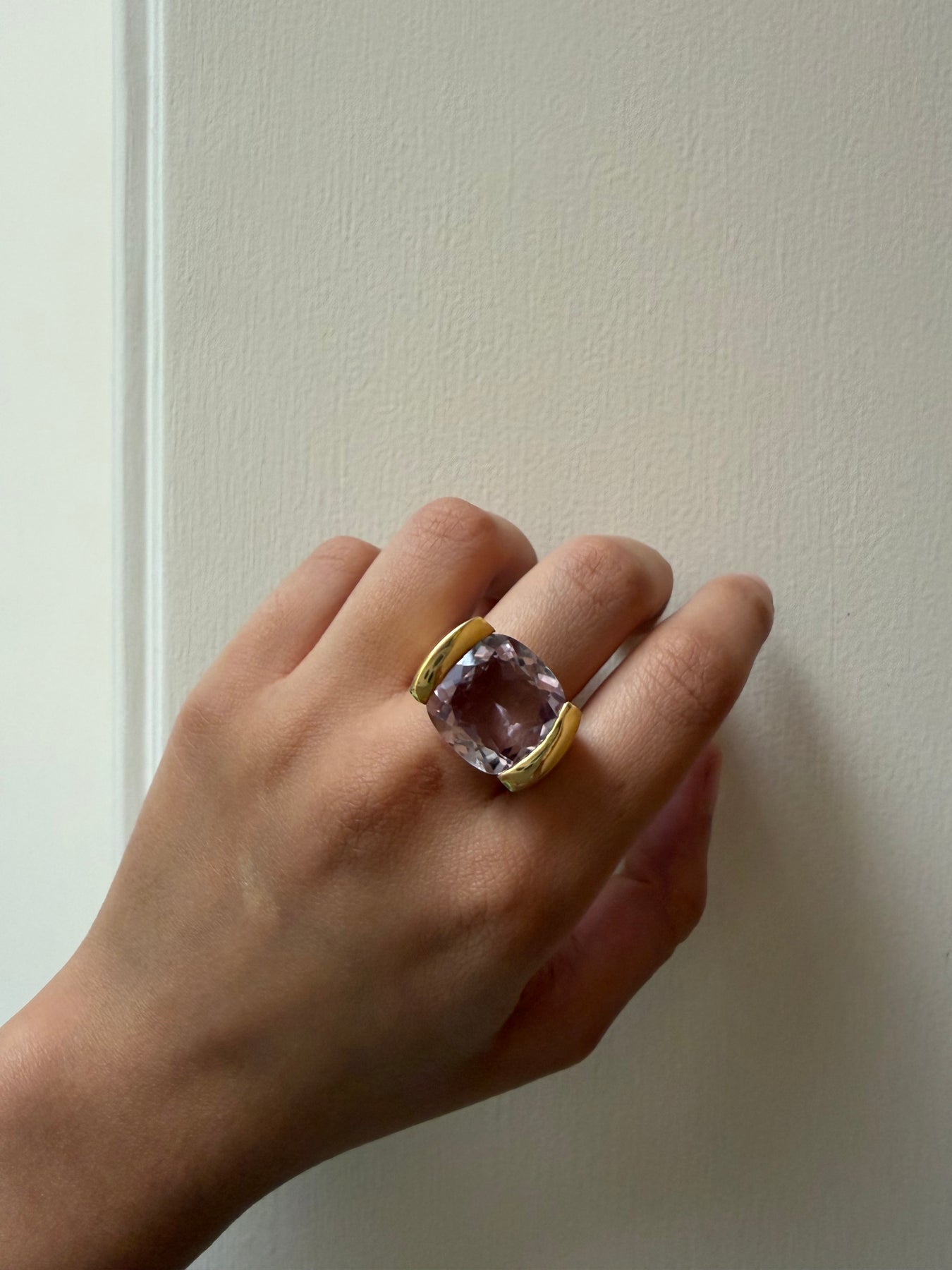 A bold, chunky silhouette set with rich amethyst, known for its calming and balancing energy. Crafted in silver and base metal, and finished with a luxe gold dip, this piece is designed to make a striking yet effortless statement.