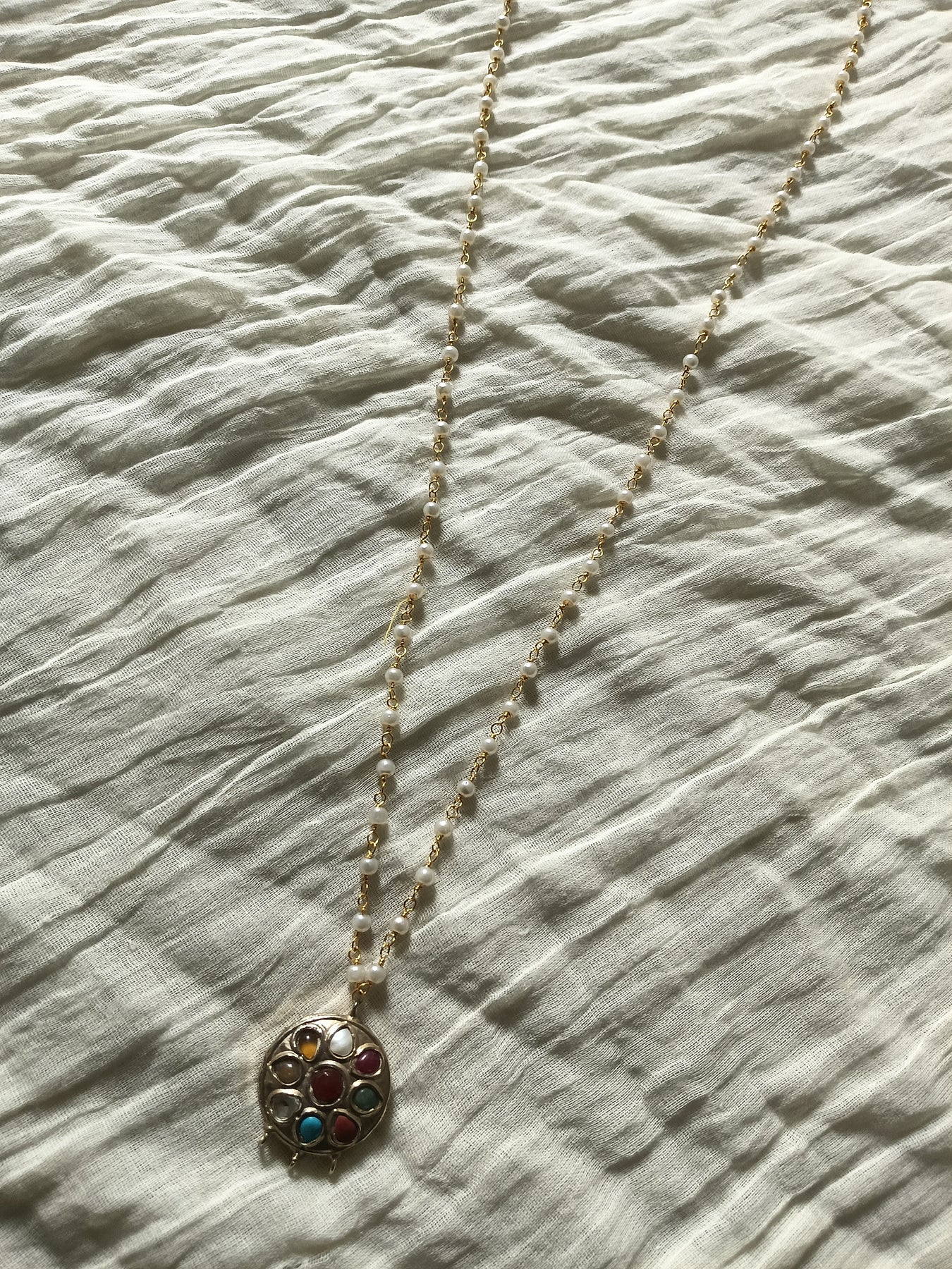 The Geet navratan Necklace is an exquisite piece featuring a string of cultured pearls and a charming navratan charm. It comes with a 24 inch chain, making it a sophisticated and elegant addition to any jewelry collection.
