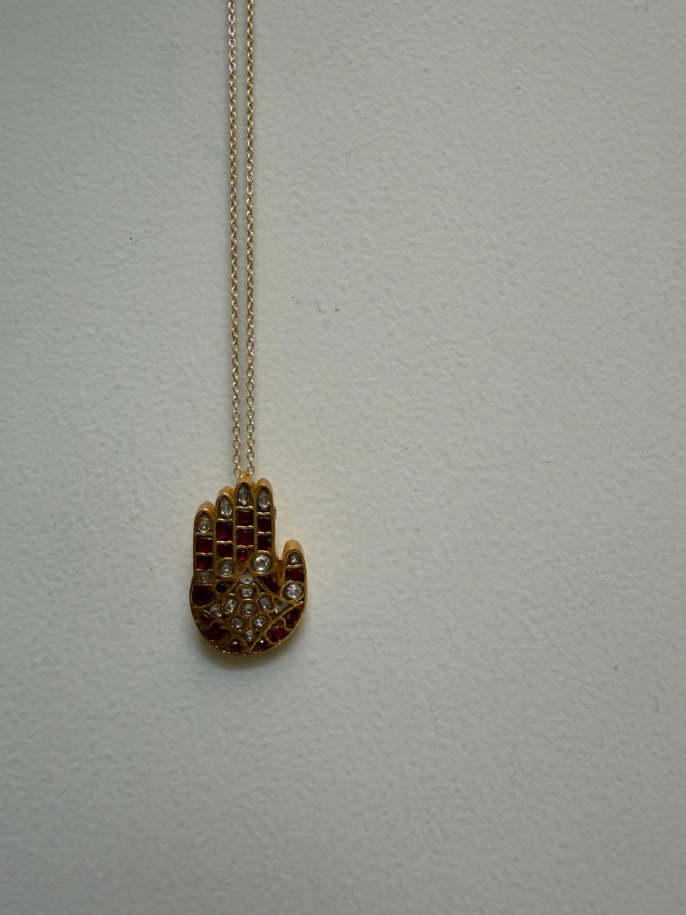 Handcrafted in alloy of silver with semi precious stones. Comes with a delicate chain of length 17inch.