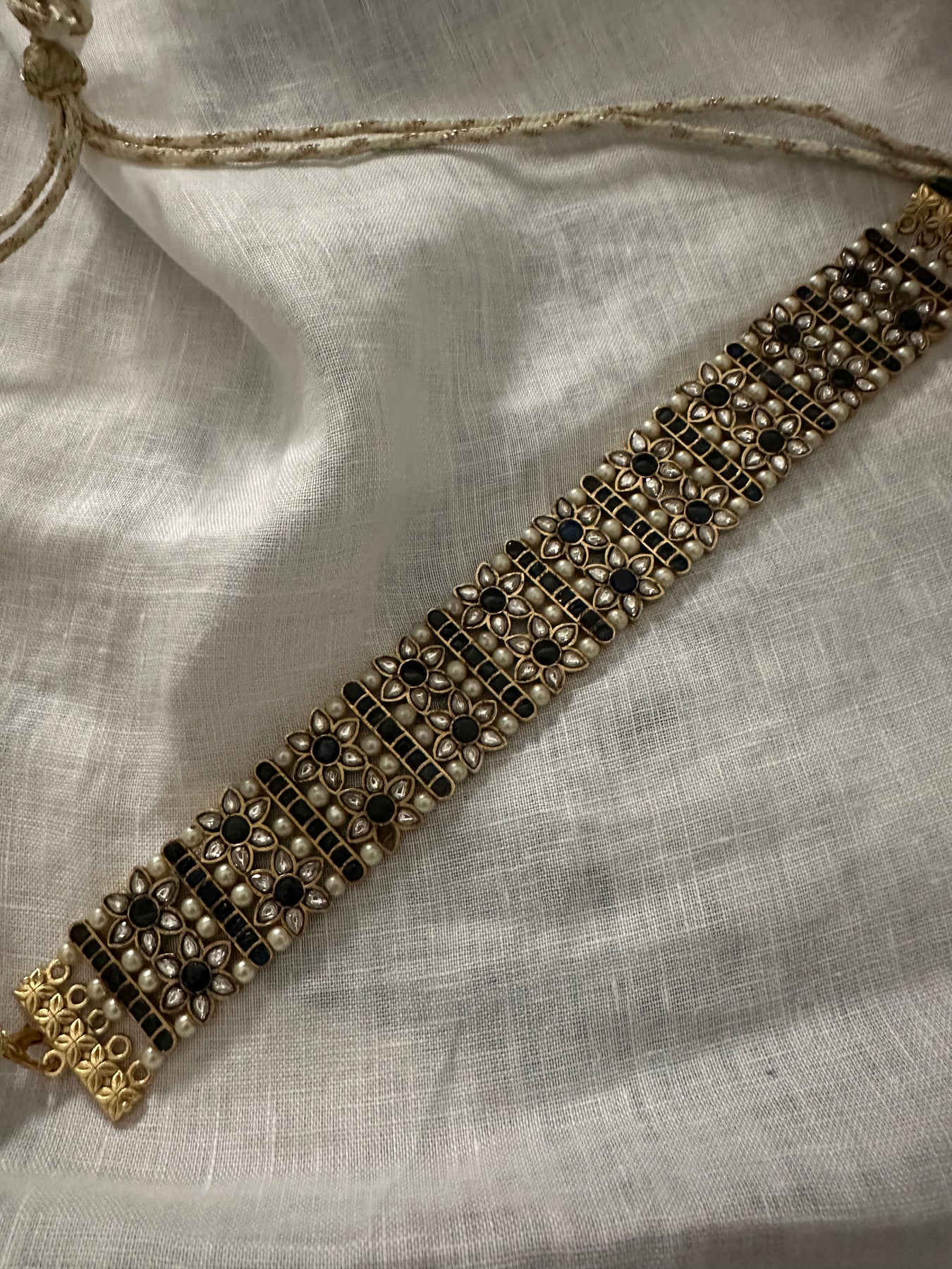 Gold plated necklace with cultured pearls and jadau charms. Comes with drawstring.