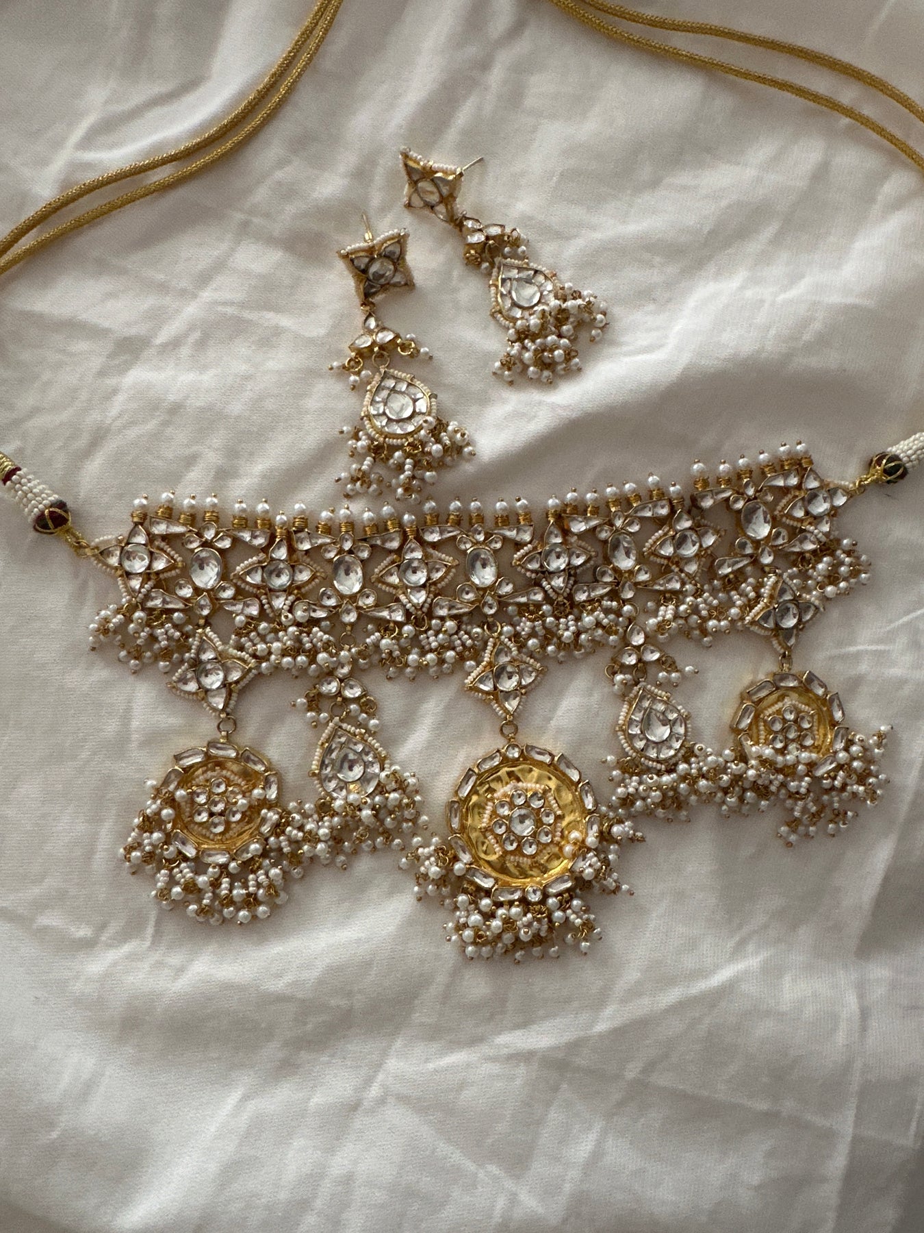 Handcrafted in base metal and silver , this beautiful necklace js made using white topaz and cultured pearls. This comes with matching earrings .