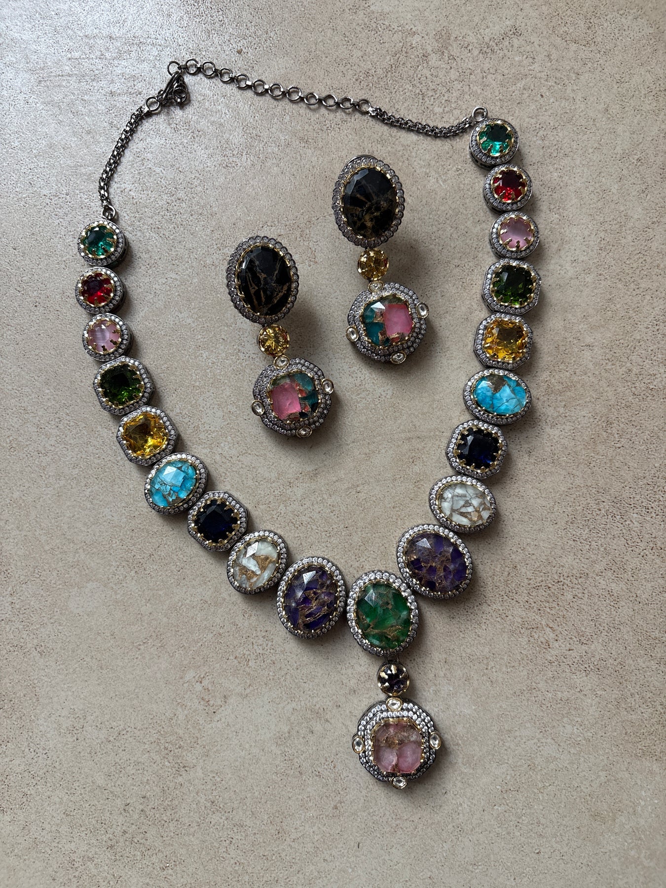 Handcrafted in base metal with semi precious and cultured stones.