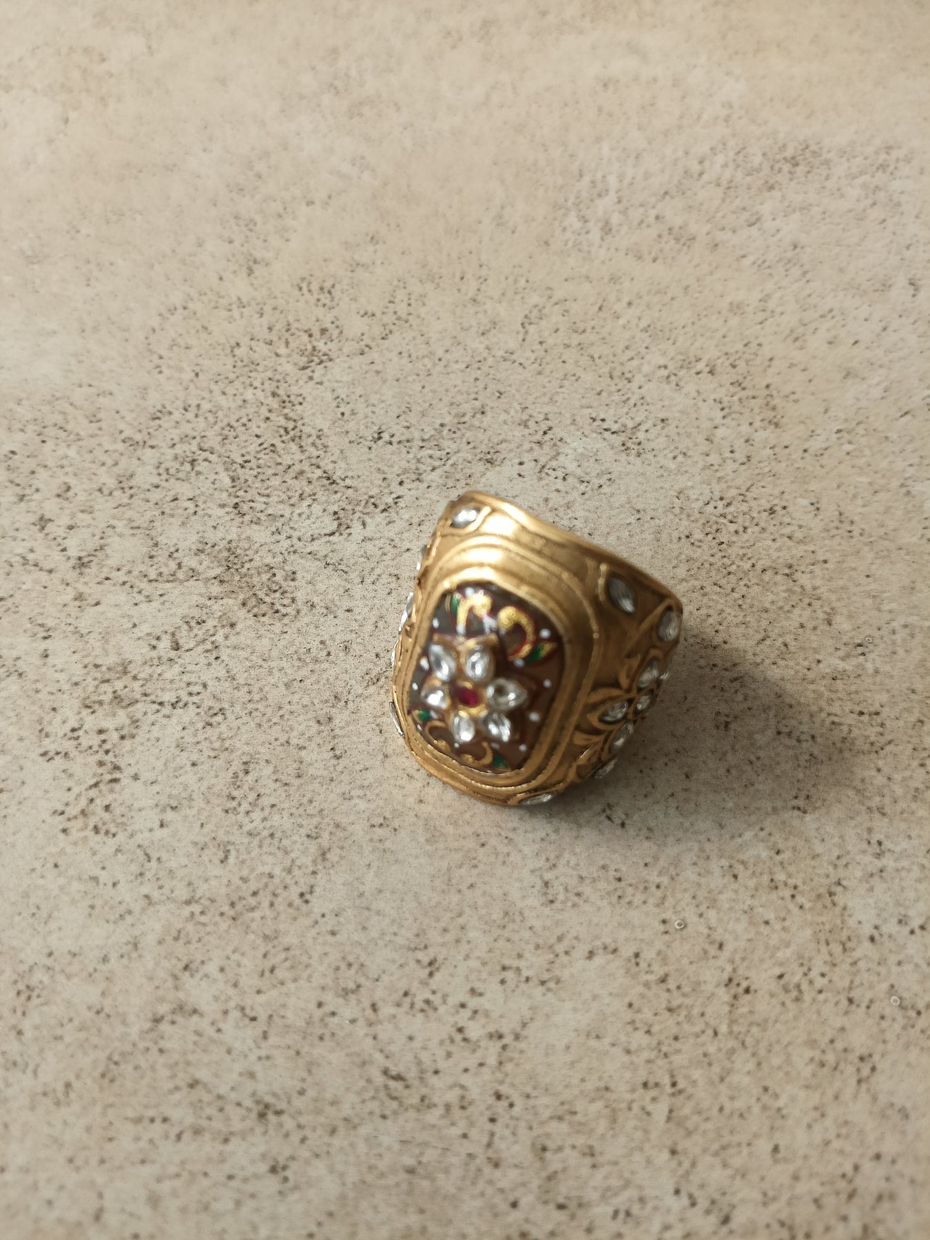 This Sawai meenakari ring showcases delicate handcrafted elements in sterling silver and opulent gold plating, accompanied by a dazzling white topaz accent.