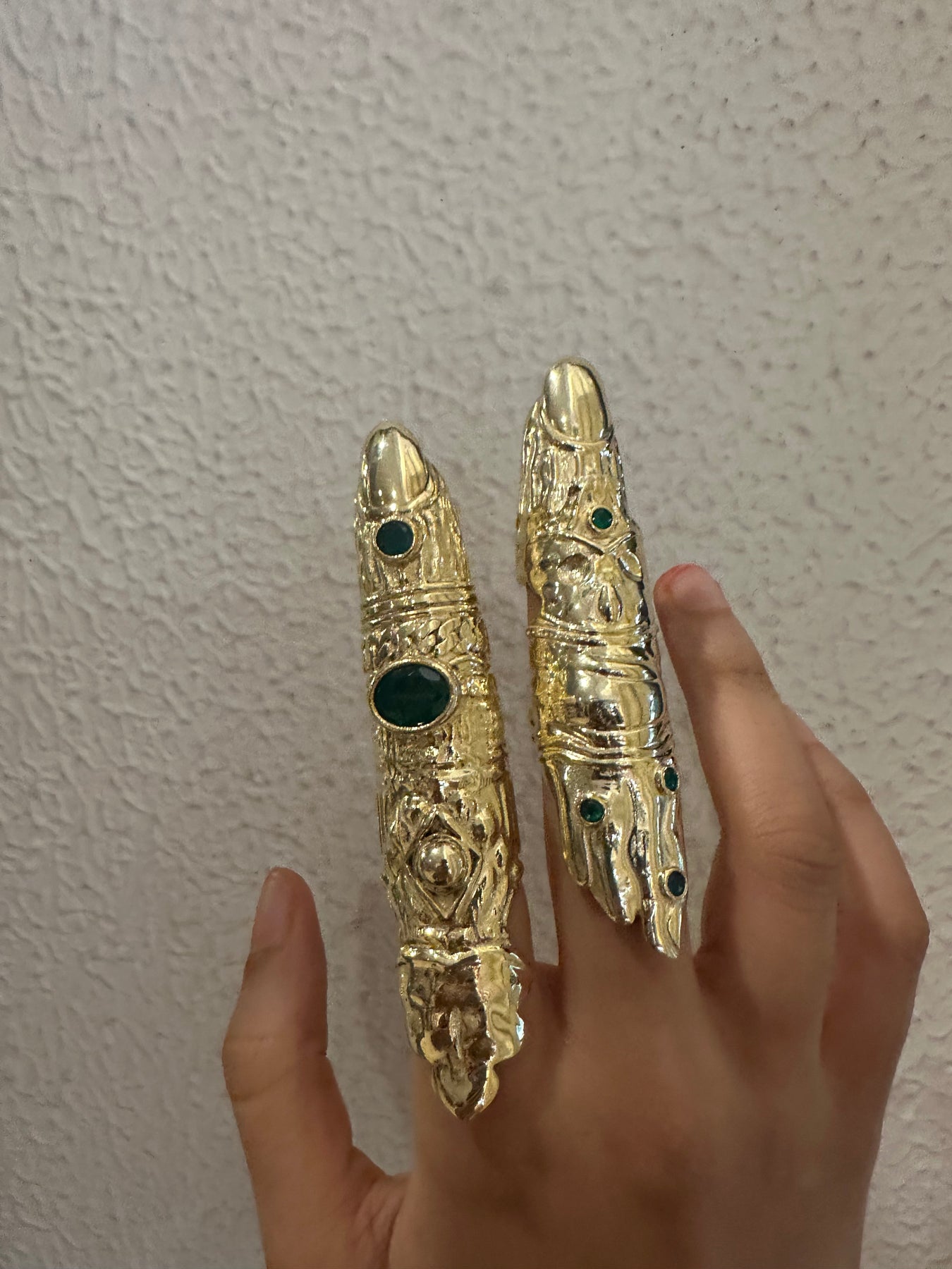 This striking full-finger ring is crafted in brass and dipped in gold for a rich, antique finish. It features intricate detailing that wraps around the finger, reminiscent of ancient armor. The centerpiece is a deep green chalcedony, adding a vibrant, mystical touch, evoking the spirit of ancient warriors.