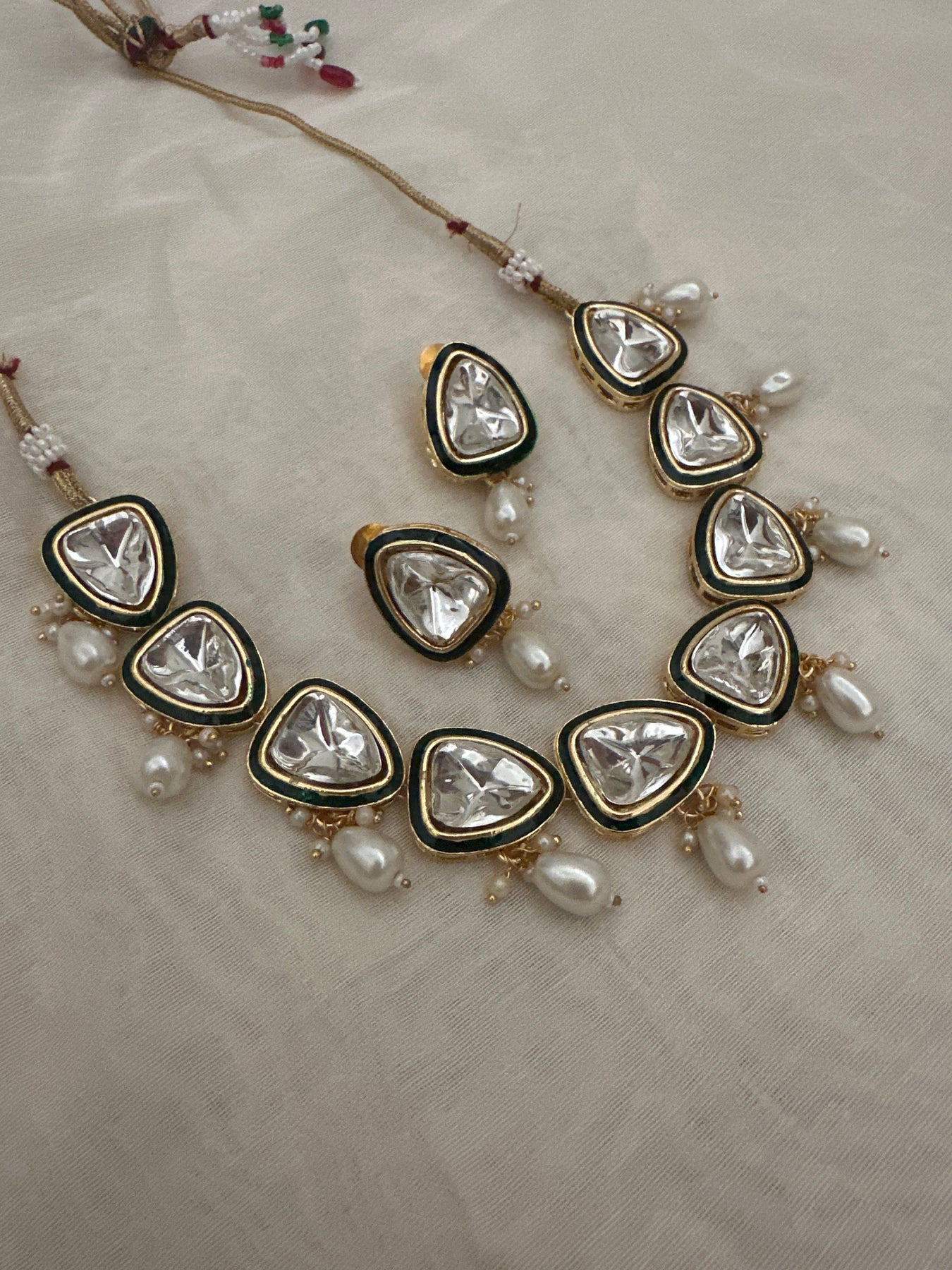 Handcrafted in base metal with cultured stone, this lightweight necklace comes with a drawstring and matching pair of earrings.