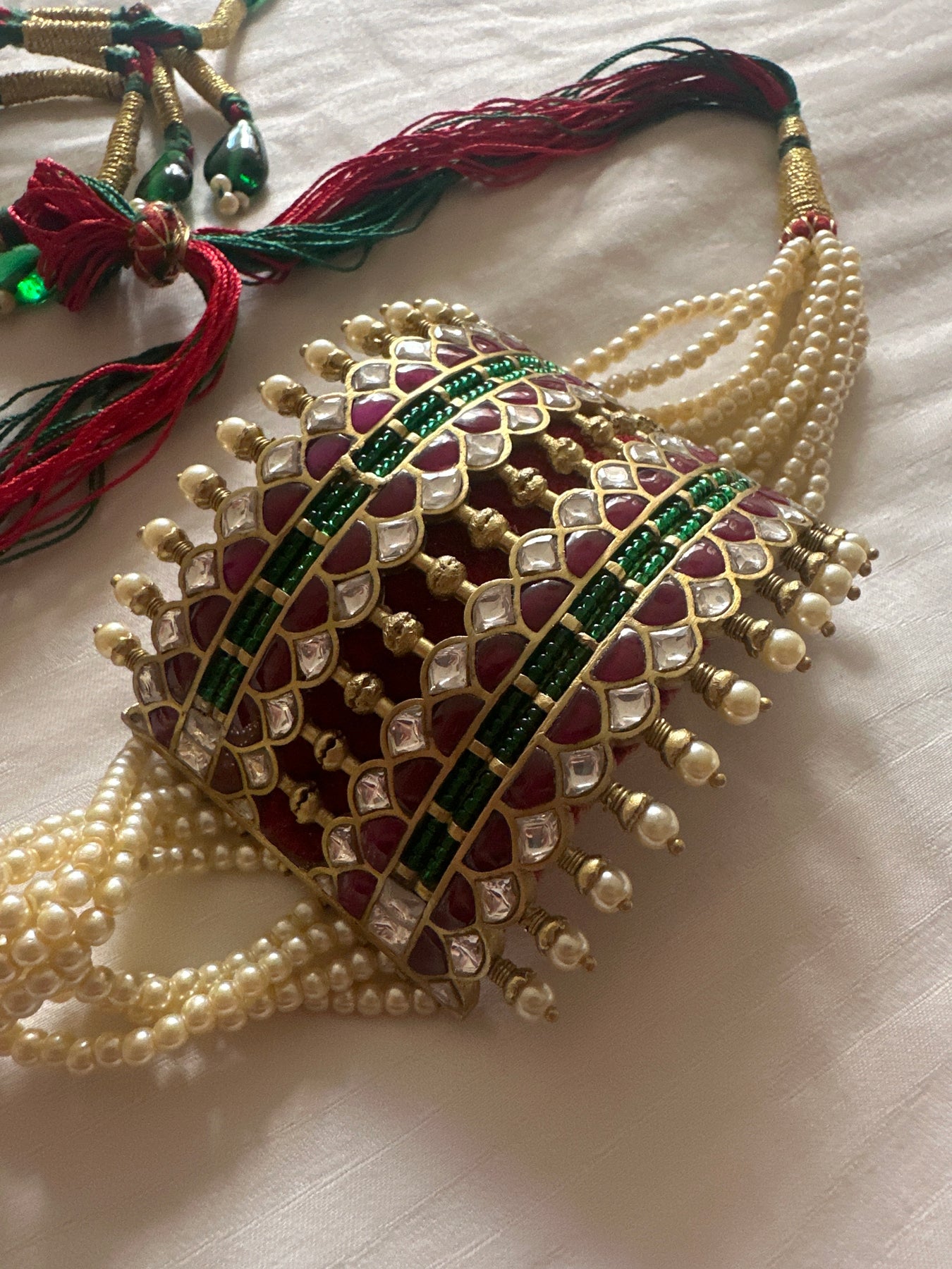 A statement bajuband handcrafted in silver and base metal, adorned with high-quality white topaz that catches the light with every movement. Designed with intricate lattice detailing and finished with delicate bead accents, this free-size armlet sits gracefully on the upper arm, adding a regal touch to bridal and festive ensembles.