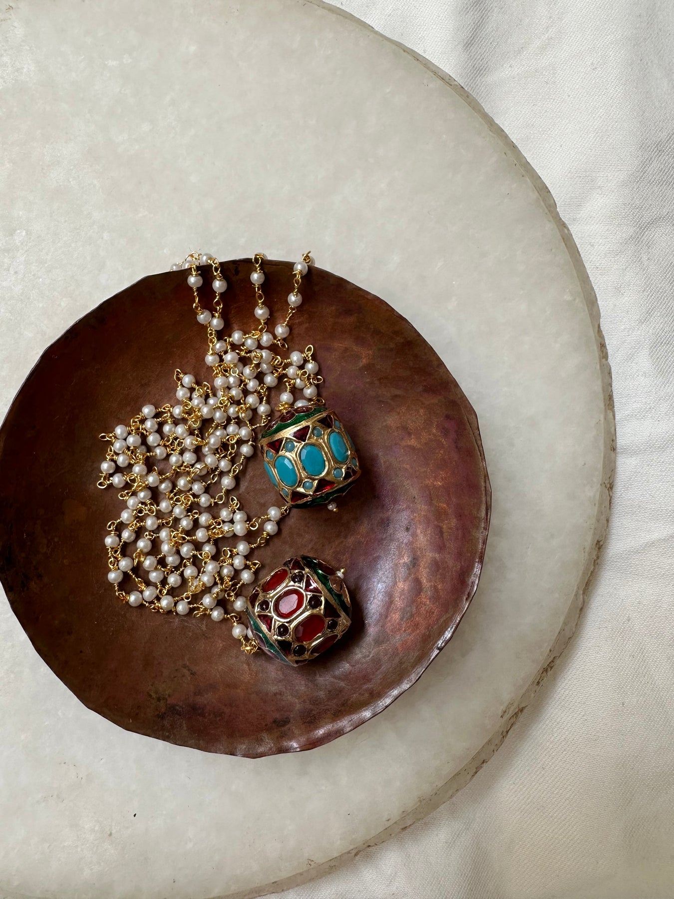 A handcrafted necklace featuring an antique Bonsho-inspired locket, drawing from the temple bells of Buddhist shrines. Made in base metal and adorned with semi-precious stones, the sculptural motif is suspended on a 22 inch strand of cultured pearls. A timeless piece that blends spiritual symbolism with artisanal detailing.