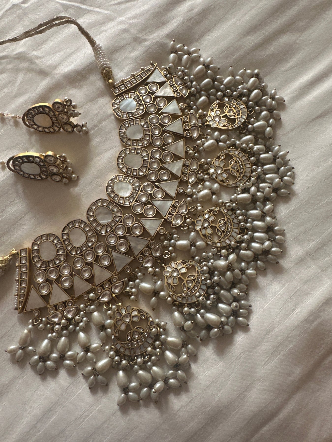 Handcrafted in silver and base metal, this bridal necklace is adorned with luminous mother of pearl and finished with cascading strands of cultured pearls. A timeless statement that blends traditional craftsmanship with bridal elegance. Comes with matching pair of earrings.