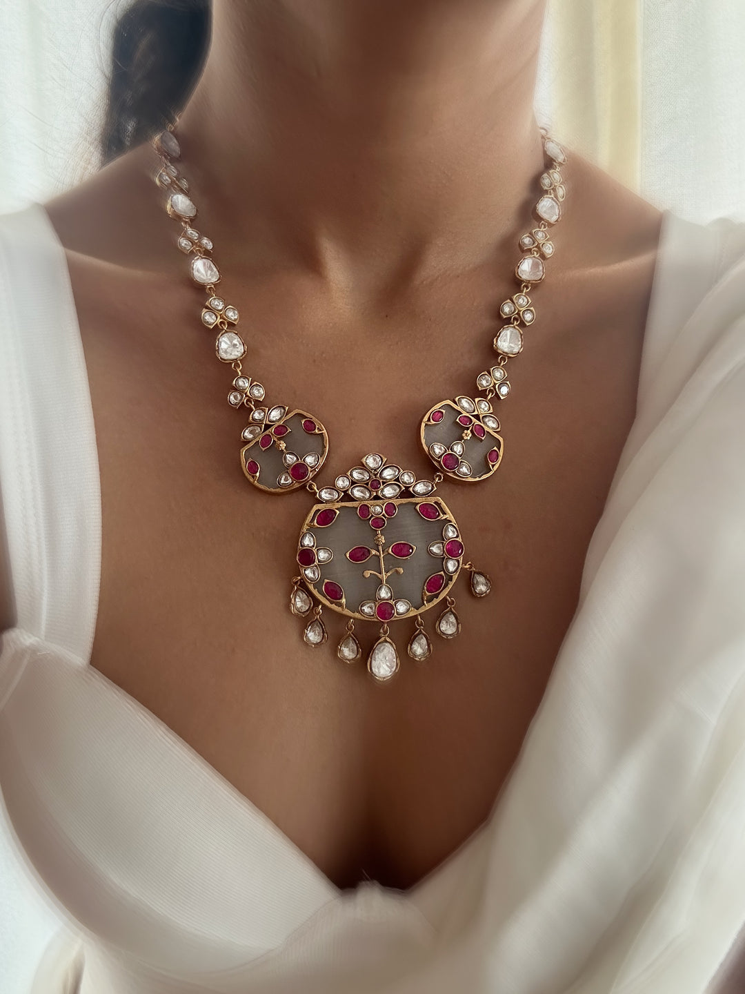 This exquisite Cavos mughal necklace is expertly crafted from silver and adorned with a glistening gold finish, showcasing attention to detail.