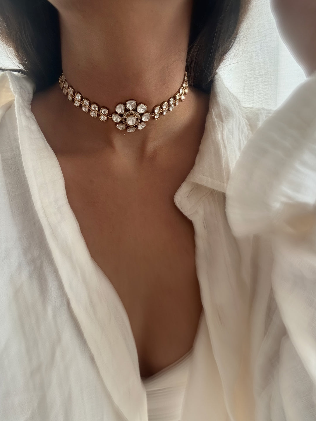 This beautiful Daisy cavos choker necklace is handcrafted with silver and carefully polished in gold for a stunning finish.