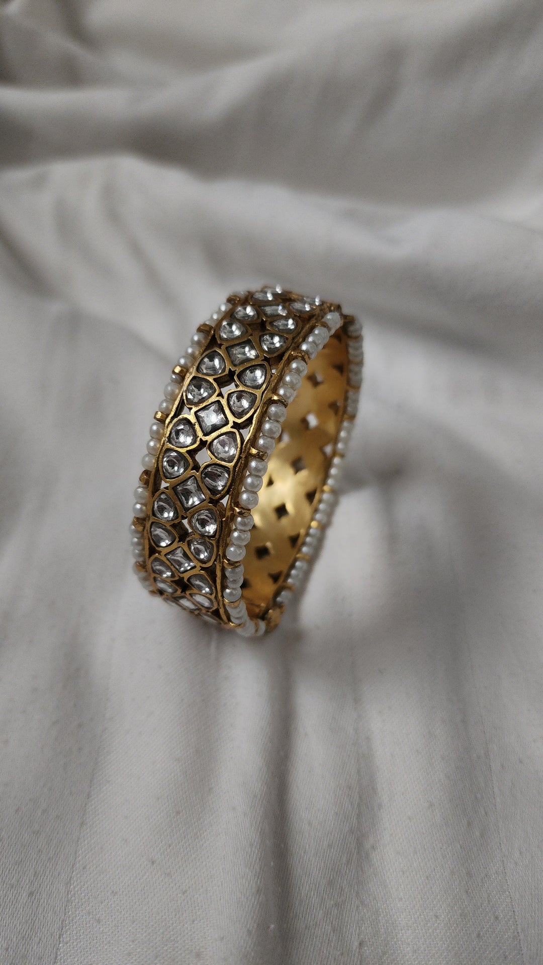 This bracelet is handcrafted with an alloy of silver, adorned with white topaz, finished in polished gold. It also features delicate antique pearls, making it a truly unique and elegant piece.