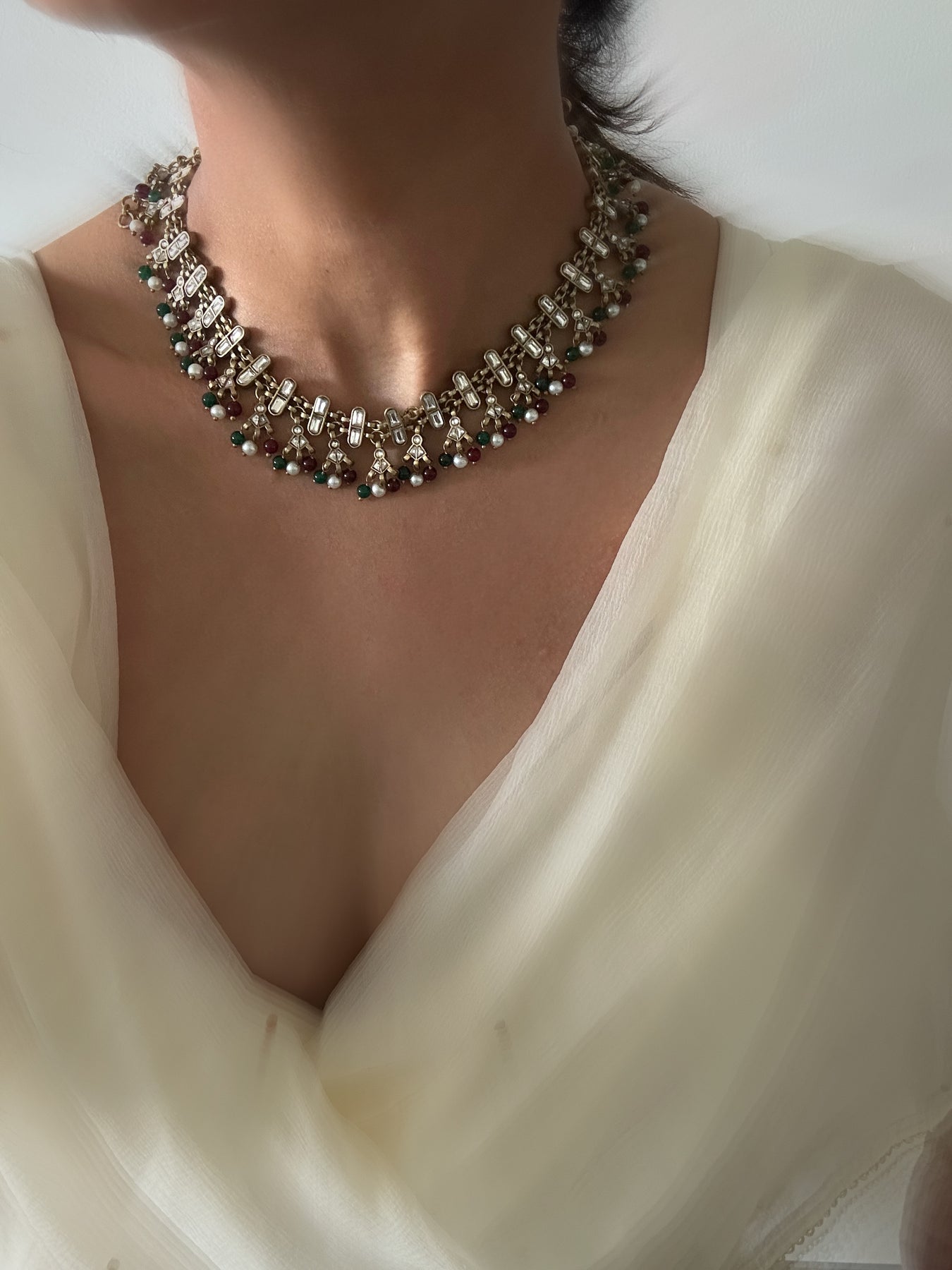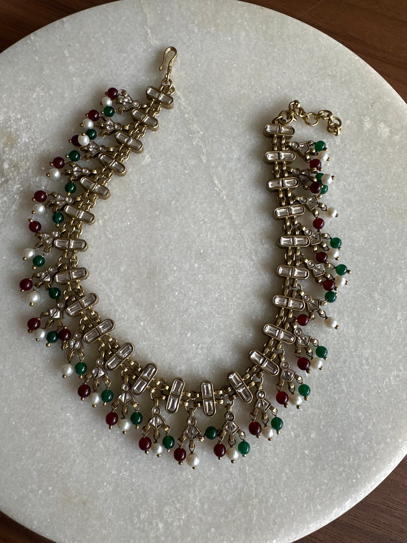 Handcuffed necklace with dull gold finish and semi precious stones hangings.