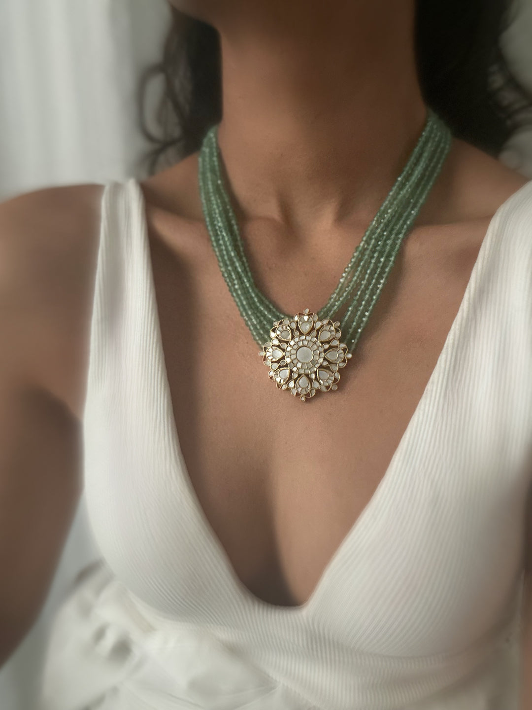 The Soma green necklace is skillfully handcrafted using semi precious stones and a mother of pearl charm. It is the perfect accessory for a complete look.