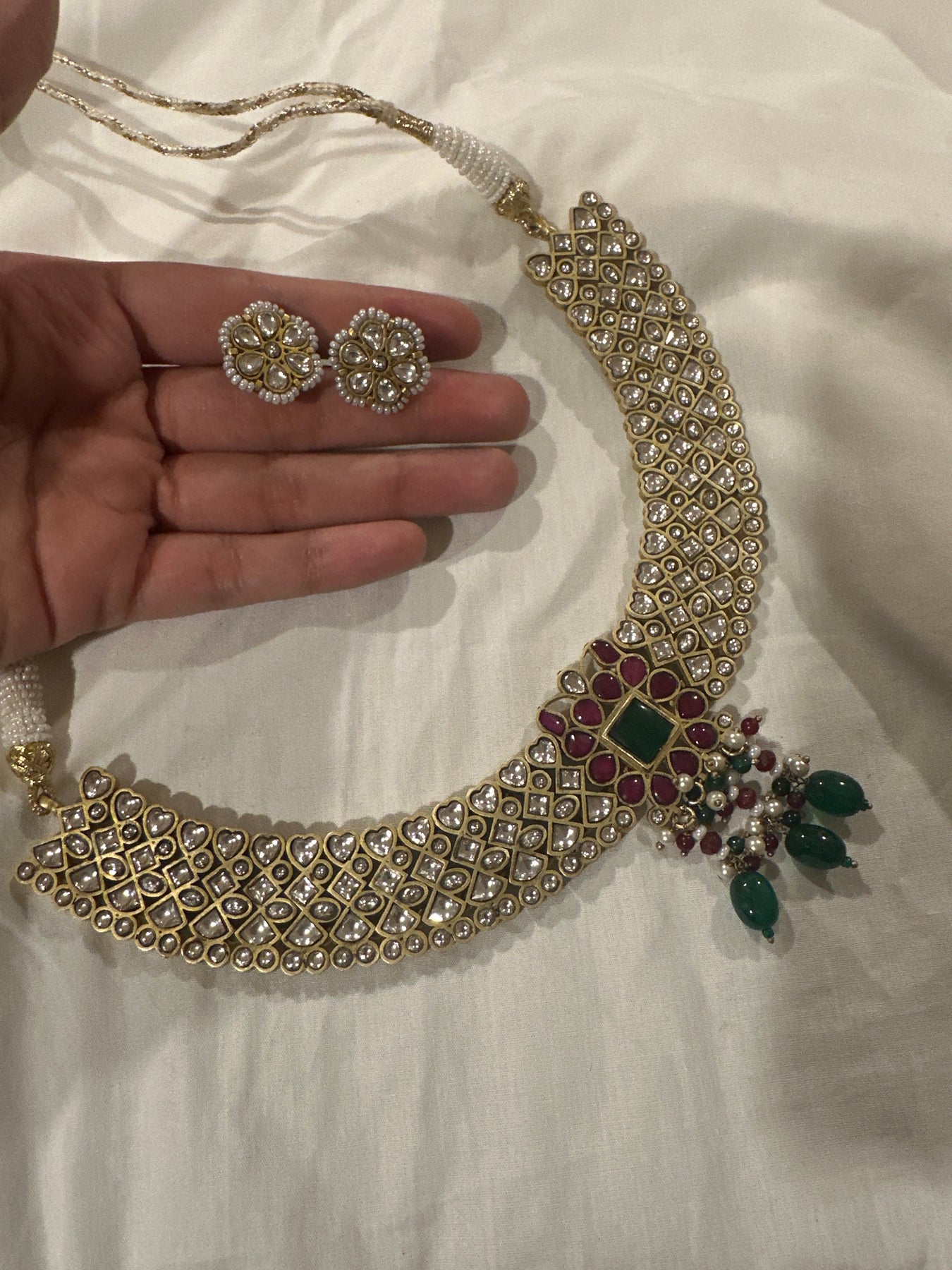 Handcrafted in Jaipur, this necklace is made in silver and base metal, set with high-quality white topaz and carefully selected semi-precious stones. Created using the traditional arts of jadau and kundan meena, it is finished with a rich dal gold polish and dipped in gold for a warm, heirloom glow. The piece is completed with a sirafa closure, reflecting thoughtful craftsmanship and timeless elegance—rooted in tradition, designed for today. Comes with earrings.