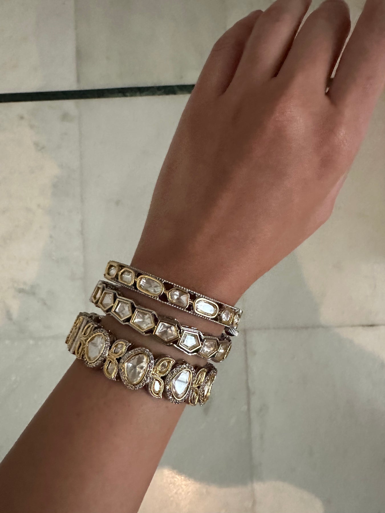 Handcrafted in base metal and silver with white toes. These bangles are openable and comes size 2.6.
