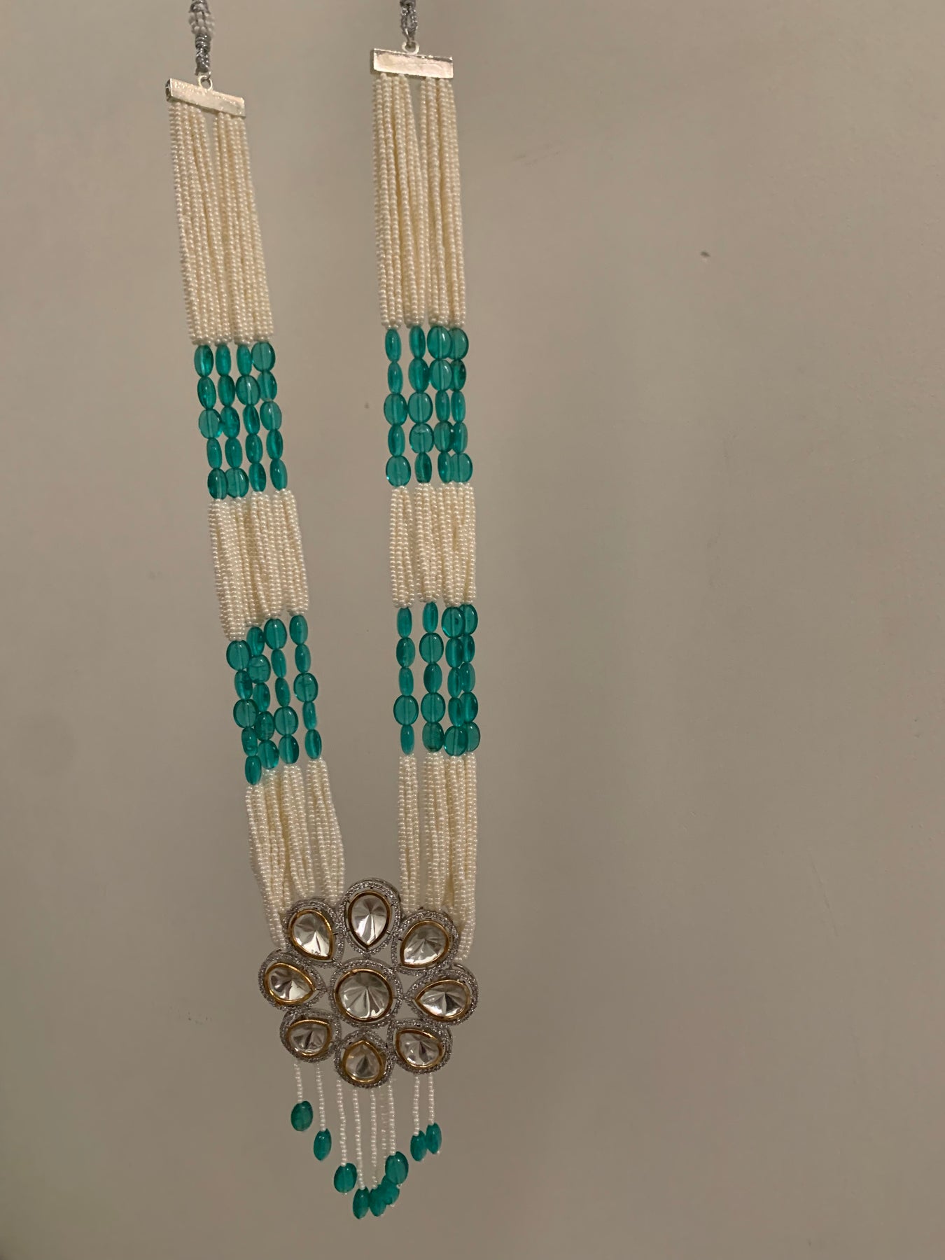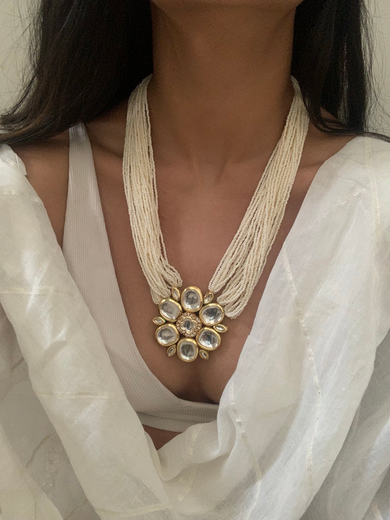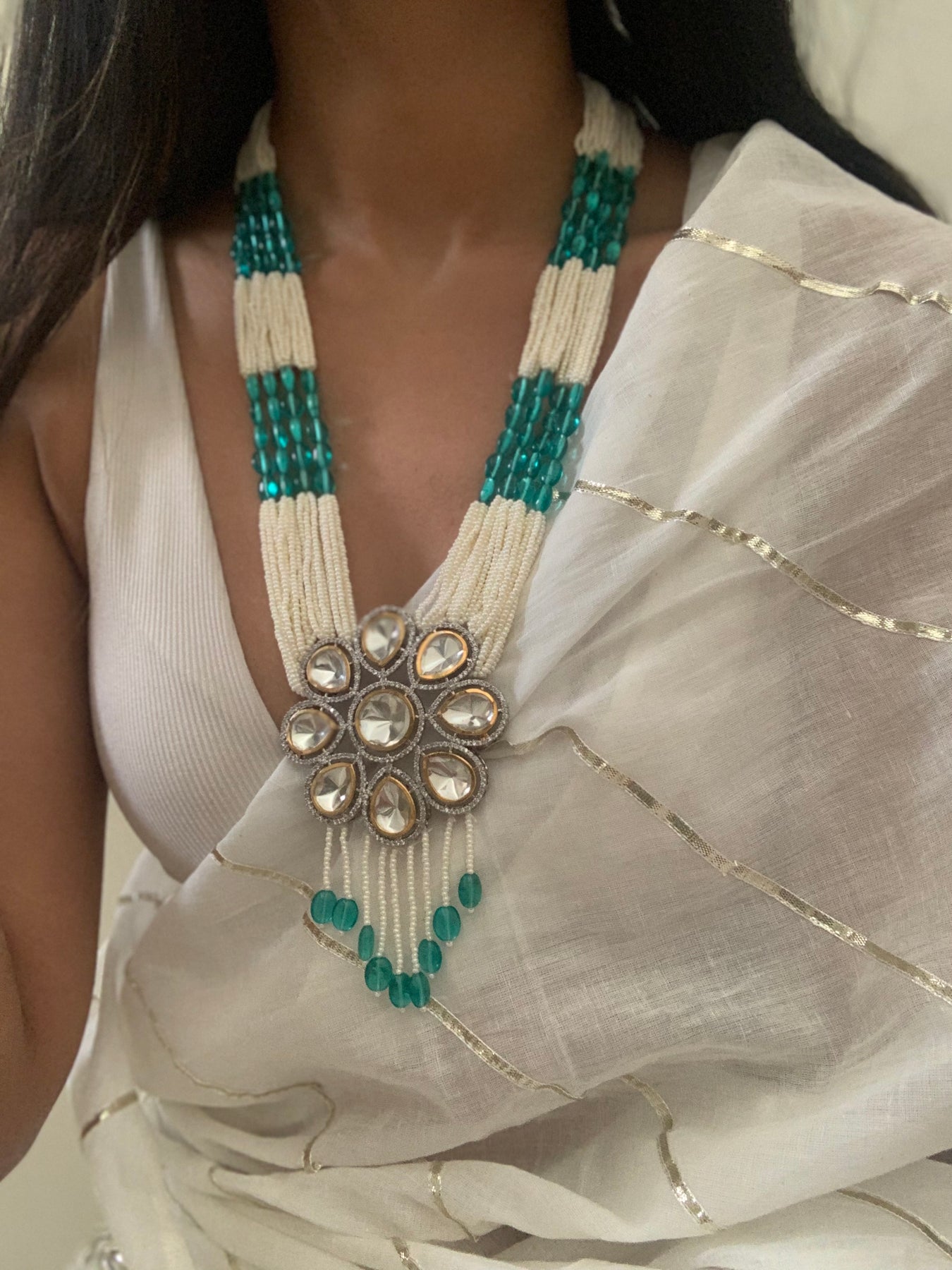 The Naveen necklace is adorned with pearls and semi precious stones. It exudes a sophisticated and elegant charm.